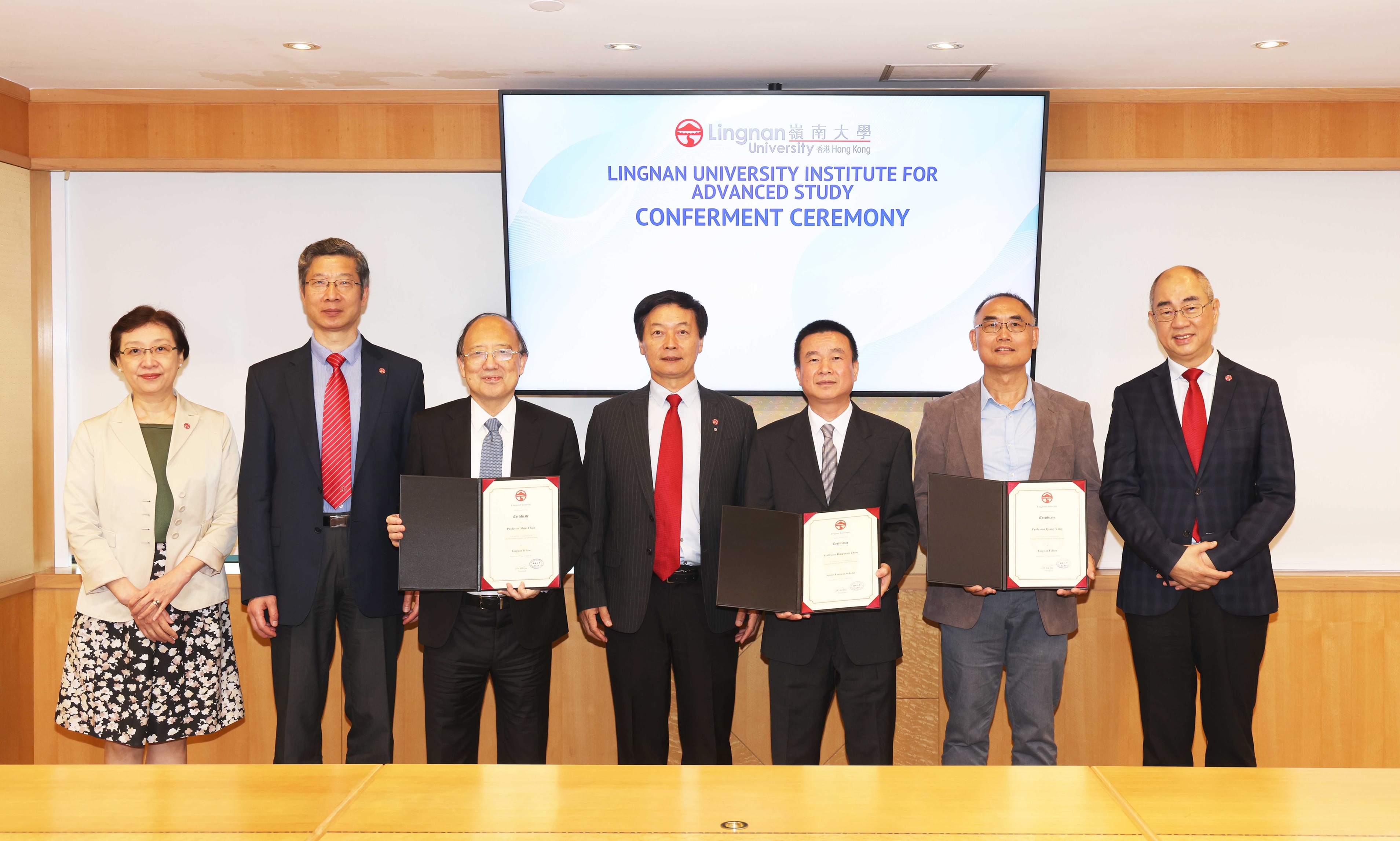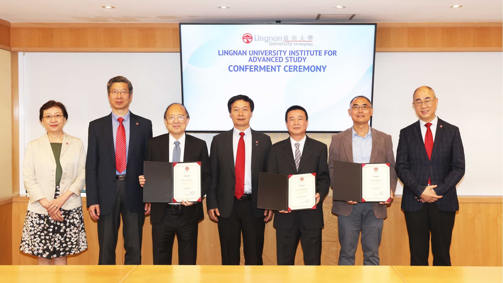 Lingnan University held the conferment ceremony for the Lingnan University Institute for Advanced Study (LUIAS) today, 11 April, welcoming three leading international scholars―Prof Chen Shiyi , President of the Eastern Institute of Technology, Ningbo, and Prof Yang Qiang, Professor Emeritus of the Hong Kong University of Science and Technology (HKUST), who were made Lingnan Fellows, and the title of Senior Lingnan Scholar was conferred on Prof Zhou Dingxuan, Professor and Head of the School of Mathematics and Statistics of the University of Sydney—to recognise their important contributions to academic achievements.