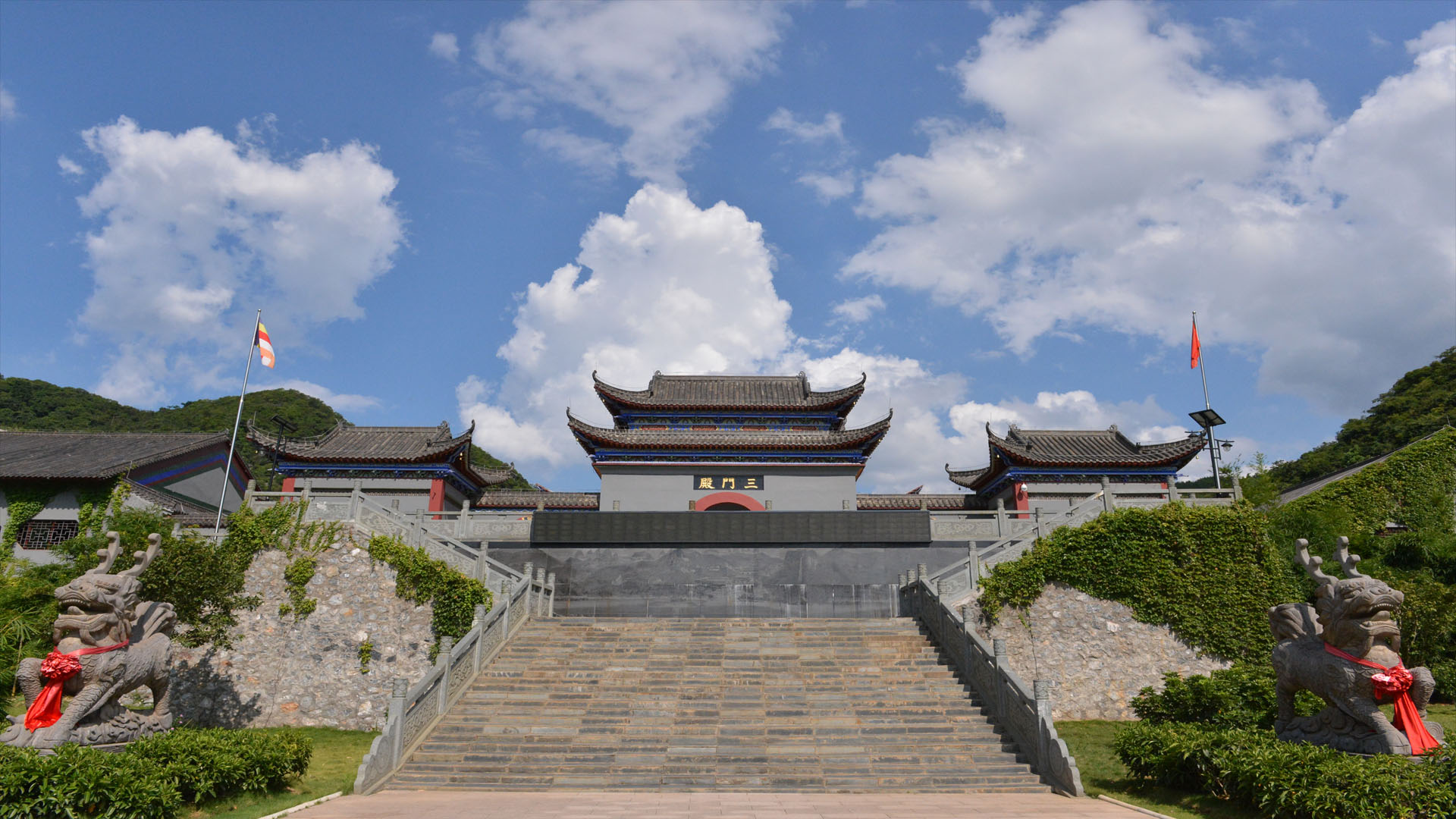 穿過牌坊,東華禪寺獨具特色的三門殿映入眼帘。東華禪寺打破傳統,以三門殿替代天王殿。往昔,三門開啟規制嚴格,皇帝走中門,臣子隨從走兩側。東華禪寺革新做法,平日敞開中間之門,視每位信眾為尊貴之人,盡顯尊重,這也是東華家風的體現。三門中,「般若門」寓意開啟智慧,「解脫門」象徵修行後獲得解脫,信眾穿行其間,收穫心靈洗禮。