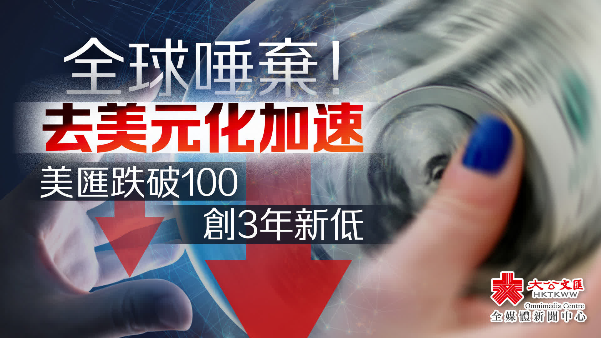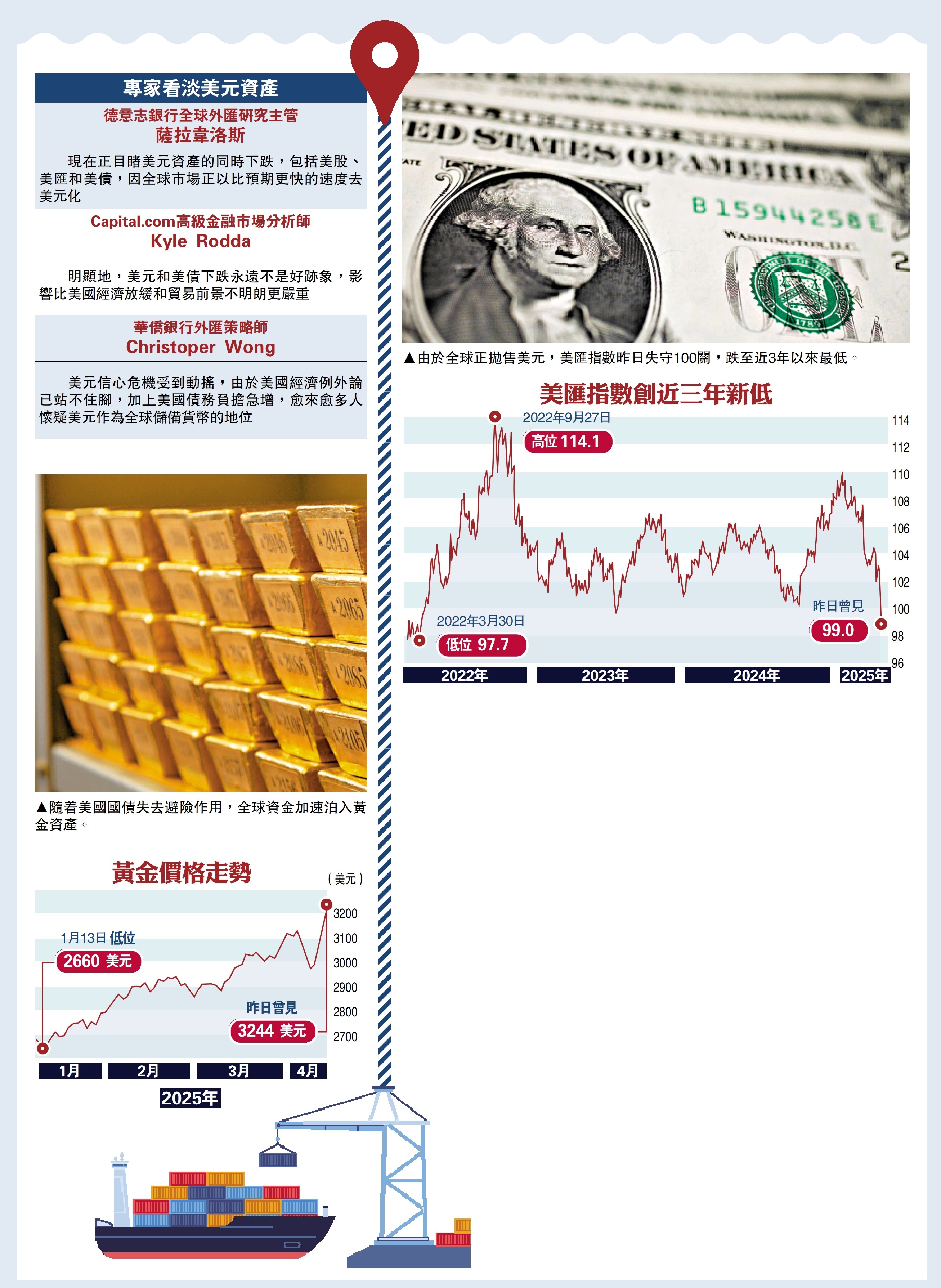 (大公報記者 李耀華)中國宣布將從今日(12日)起對美國進口商品的額外關稅從84%提高至125%後,美元周五(11日)在歐洲時段的沽壓迅速加劇。反映美國與主要貿易夥伴貨幣匯率表現的美匯指數,曾跌穿100水平,低見99水平,為接近3年以來最低。德意志銀行發表的報告指出,全球去美元化的速度將會比市場預期更快。