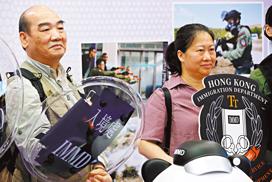 (香港文匯報記者 唐文、洪澤楷)周二(15日)將迎來第十個全民國家安全教育日。特區政府保安局8個紀律部隊和輔助部隊在本月不同的周末及假日舉行開放日,入境事務學院、香港懲教博物館及社區教育體驗館和民眾安全服務隊總部昨日免費向市民開放,打響頭炮。雖然陰天有雨,市民仍然熱情不減,入境處和民眾安全服務隊估計昨日全日分別有4,000人次和逾2,000人次到場。有不少市民與親朋好友結伴,齊齊「走進國安教育」。他們在接受香港文匯報訪問時表示,現場多樣的趣味活動讓他們在寓教於樂中了解紀律部隊維護國家安全的工作,增加了對國家安全的認識。有市民感嘆道,近年社會氛圍日趨良好,與2019年修例風波期間已是「不同的天地」,他對現在的生活倍感安心,相信大多數市民亦有同感。