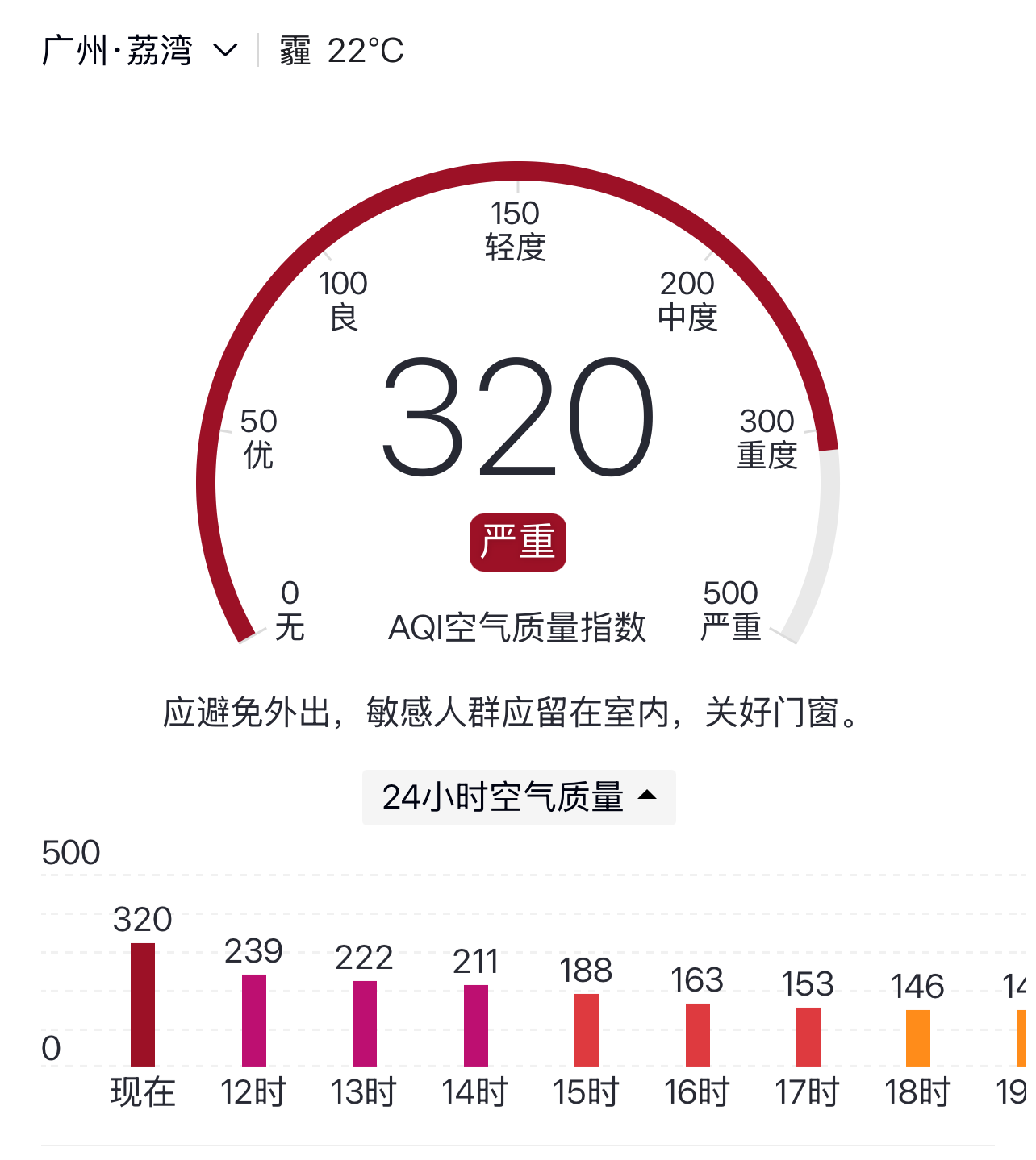 從大灣區11市看,至下午4時,香港空氣污染指數為155,已經是大灣區「最優」,遠低於同時間廣州的指數(約320)。