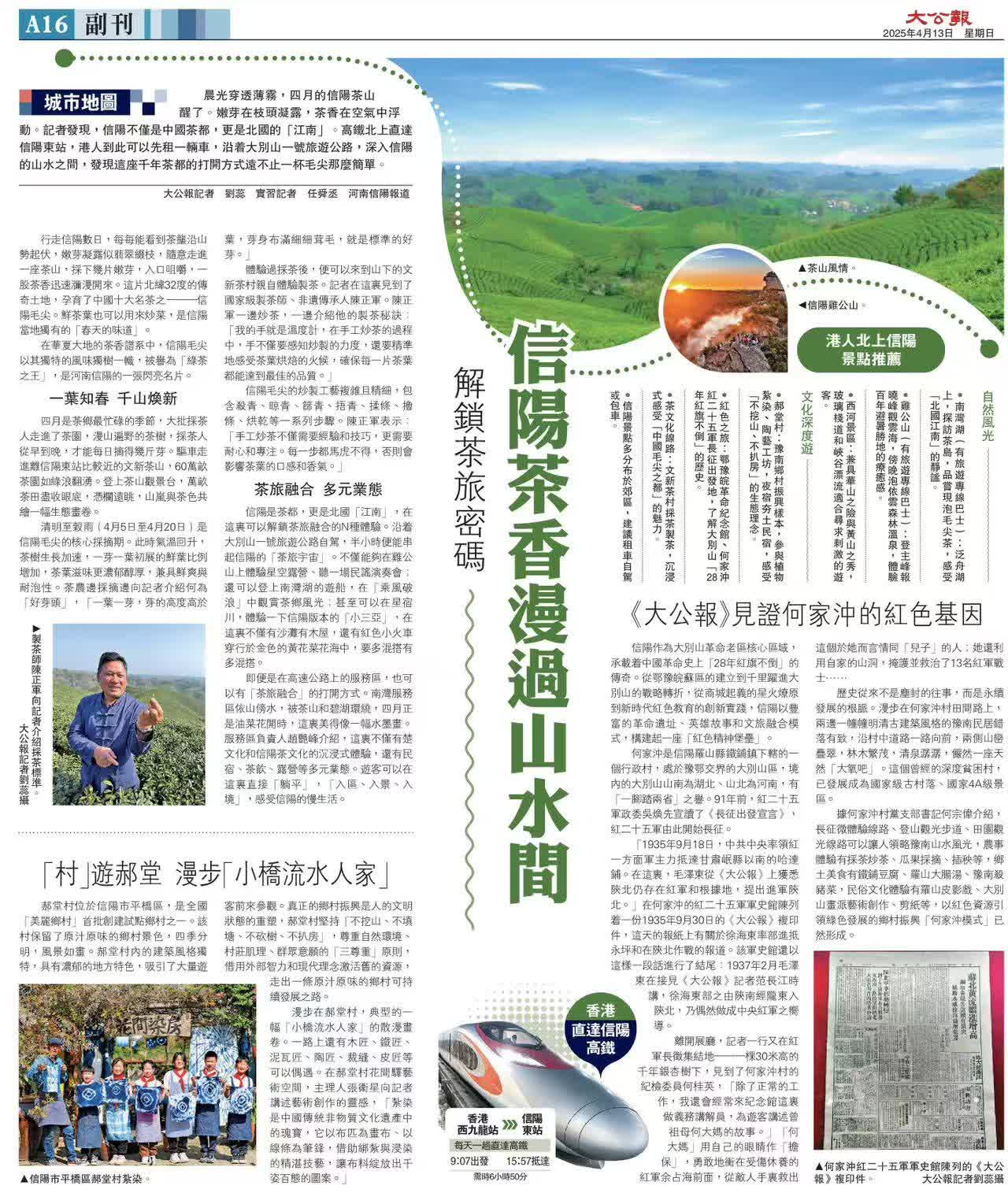 (記者 劉蕊 實習生 任舜丞 河南報道)晨光初透,四月的信陽茶山已然甦醒。在文新茶村,鐵鍋中鮮嫩的茶葉正在翻騰,一縷縷茶香穿透時空,浸潤着信陽的山水。記者深入千年茶都信陽,親身體驗了大別山一號旅遊公路的茶旅融合,細細品讀了紅色基因的當代傳承,用腳力丈量了鄉村振興的發展之路。