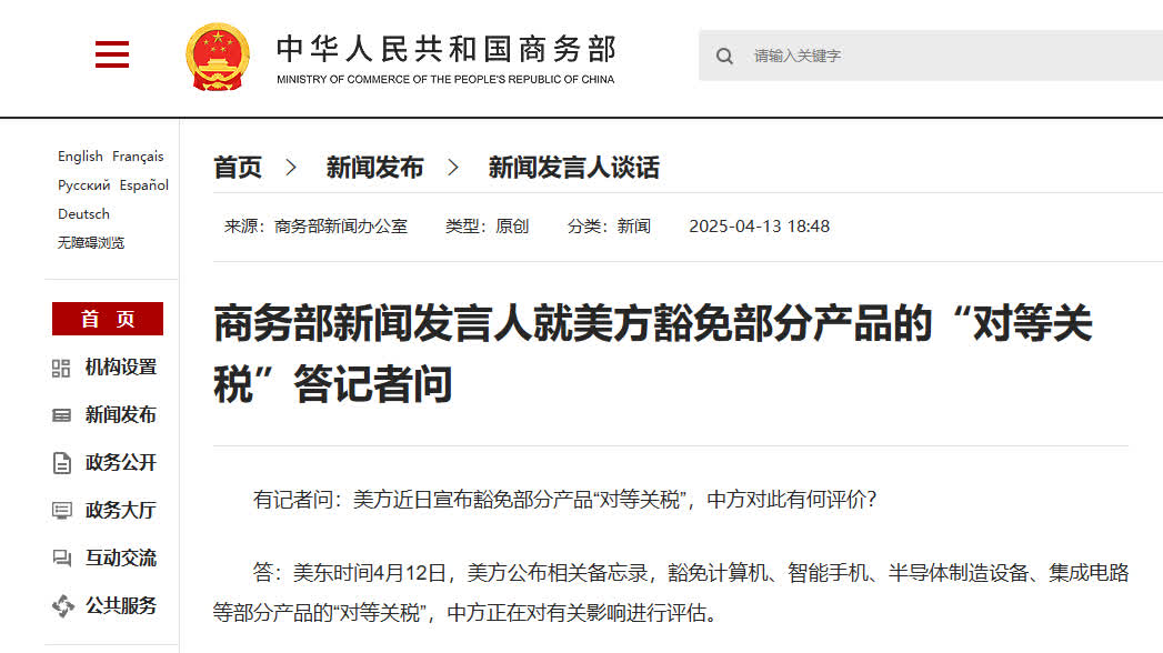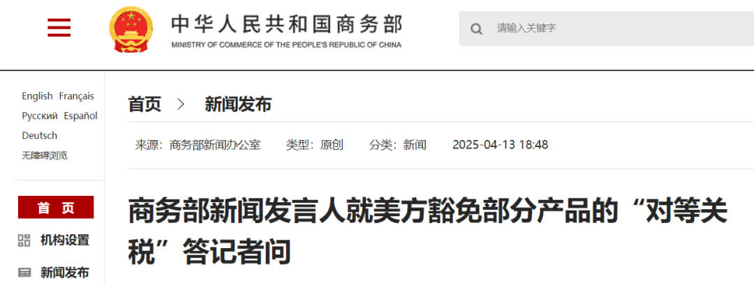 大公文匯網報道,據商務部網站4月13日消息,商務部新聞發言人就美方豁免部分產品的「對等關稅」答記者問。