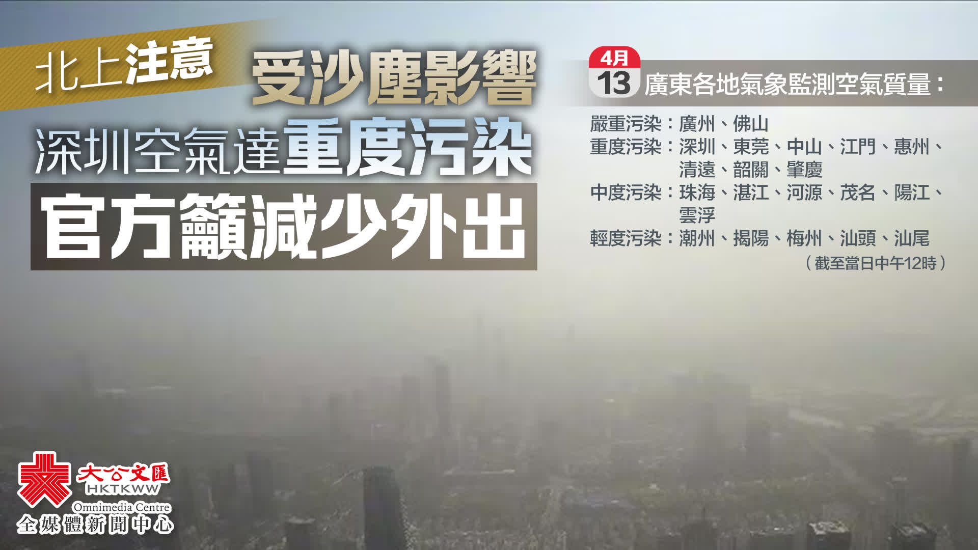 據央視新聞報道,4月12日下午起,因受北方沙塵遠距離傳送影響,廣東省發生大範圍污染天氣過程,首要污染物為PM10。廣東省生態氣象中心預計,4月14日—16日廣東省風力明顯減弱,空氣較乾燥,粒子直徑較小的顆粒物懸浮停滯在空中,不容易快速消散,因此中北部市縣仍有分散浮塵;4月17日,隨着風力增大,浮塵消散,此次沙塵天氣結束。