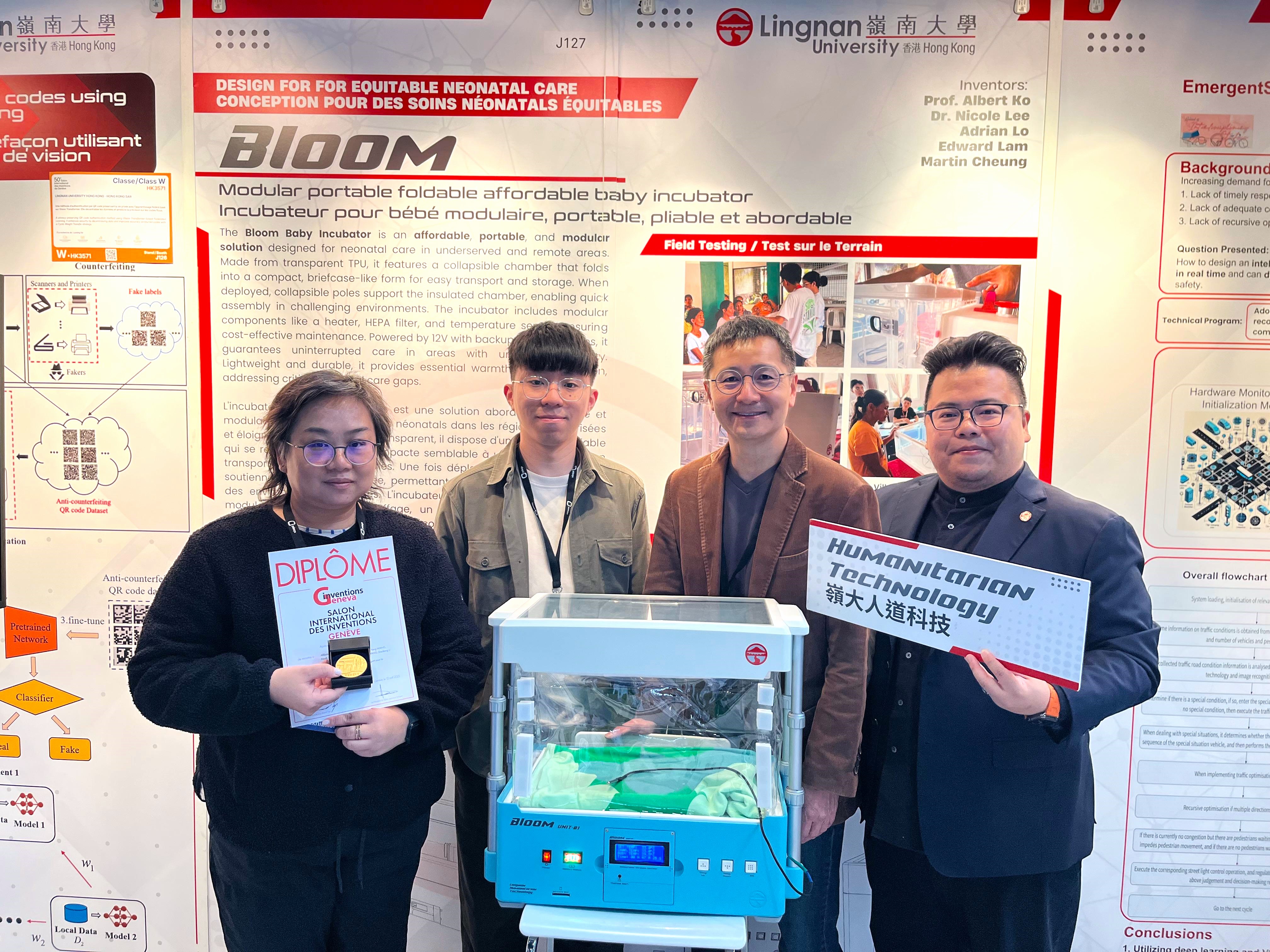 「BLOOM - A Low-cost, Energy-efficient Baby Incubator Designed for Remote and Rural Communities in Developing Countries」, which was developed by a team led by Prof Albert Ko, Director of Office of Service-Learning and Lingnan Entrepreneurship Initiative (LEI), has been awarded the Gold Medal with Congratulations of the Jury.
