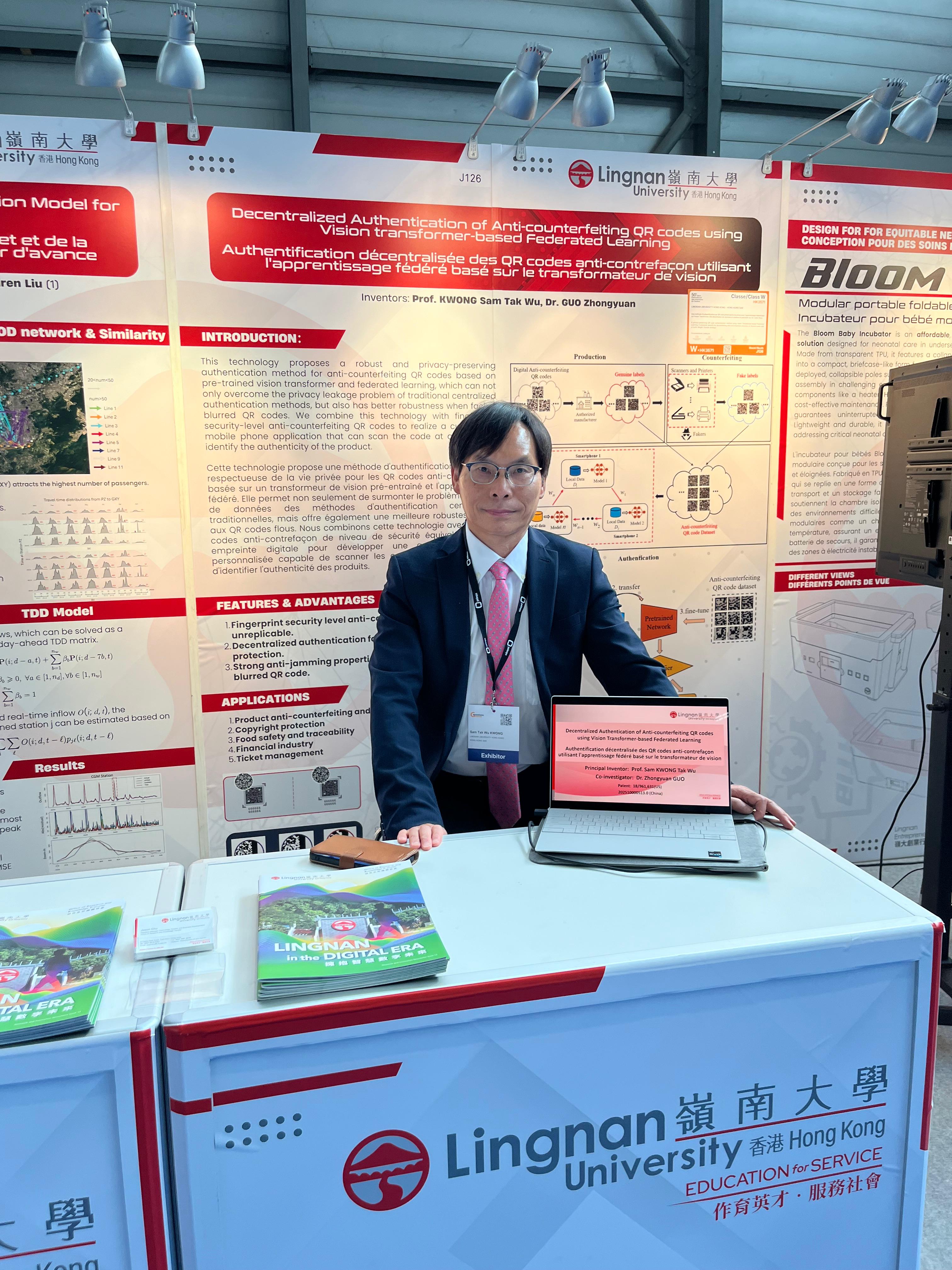 Prof Sam Kwong Tak-wu, led the research project on 「Decentralised Authentication of Anti-Counterfeiting QR Codes Using Vision Transformer-Based Federated Learning」, which won the Bronze Medal, is delighted by this remarkable achievement and said, 「This award is full recognition of our team』s pioneering research and demonstrates Lingnan University』s strong commitment to cultivating young talent and transforming research outcomes into practical applications. We aim to continue addressing the urgent challenges facing the world today through innovative inventions. Moving forward, we will deepen our efforts in the relevant fields and actively expand our networks with the government and industry, and leverage our research capabilities to make greater contributions to society.」