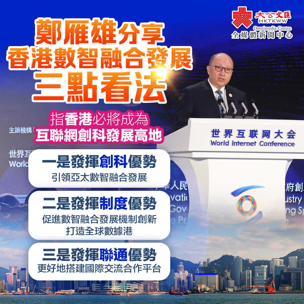 鄭雁雄表示,香港是互聯網發展的先行地區,既具備全球金融、航運和貿易中心的傳統優勢,又有AI研發、創科發展、人才集聚和產業協同等新優勢,更有制度創新、兩文三語、文化包容、「內聯外通」等獨特優勢,與網絡暢通聯絡、數智融合發展以及內在邏輯深度契合,必將成為互聯網創科、互聯網產業、互聯網文化的嶄新發展高地。