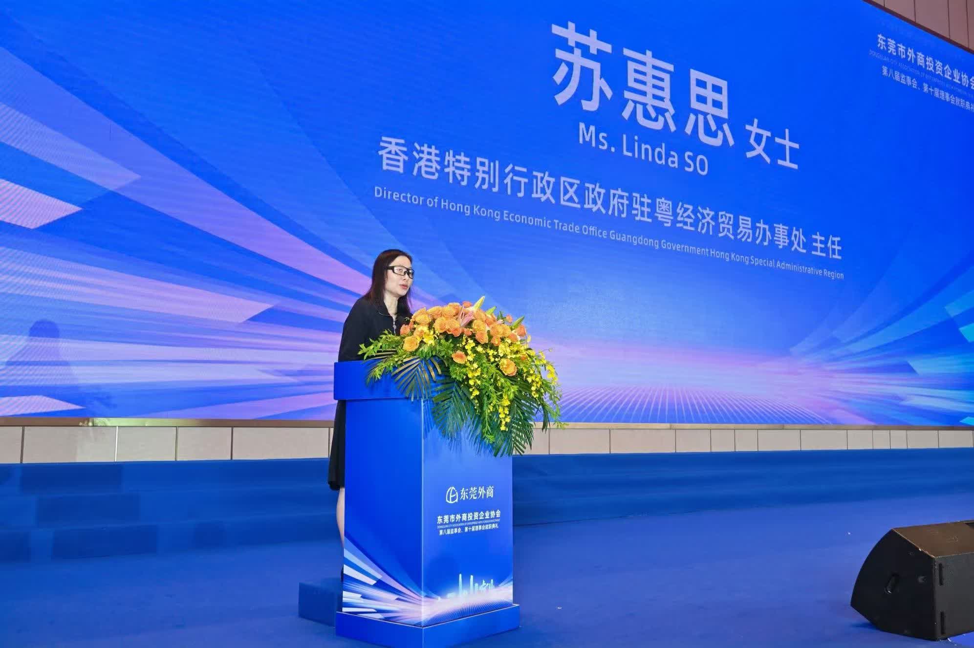 蘇惠思致辭表示,東莞市作為大灣區的重要城市之一,一直以來與香港合作無間,成果顯著。香港機場管理局在東莞設立香港國際機場東莞空港中心,推動「海空貨物聯運」模式,帶動了大灣區貨物國際通達性的整體提升,增強了進出口的國際競爭力。香港城市大學(東莞)於去年9月舉行首屆開學典禮,標誌著城大將持續為大灣區建設高水準國際化人才高地。三月,東莞市委書記韋皓率團訪問香港與行政長官會面,期間還舉辦莞港產業合作交流會,加強兩地合作。香港商務及經濟發展局局長訪問在莞港資企業,關注港資企業電商方面的發展。這些亮麗成果的背後,離不開東莞市政府,以及東莞市外商投資企業協會的大力支持和推動。