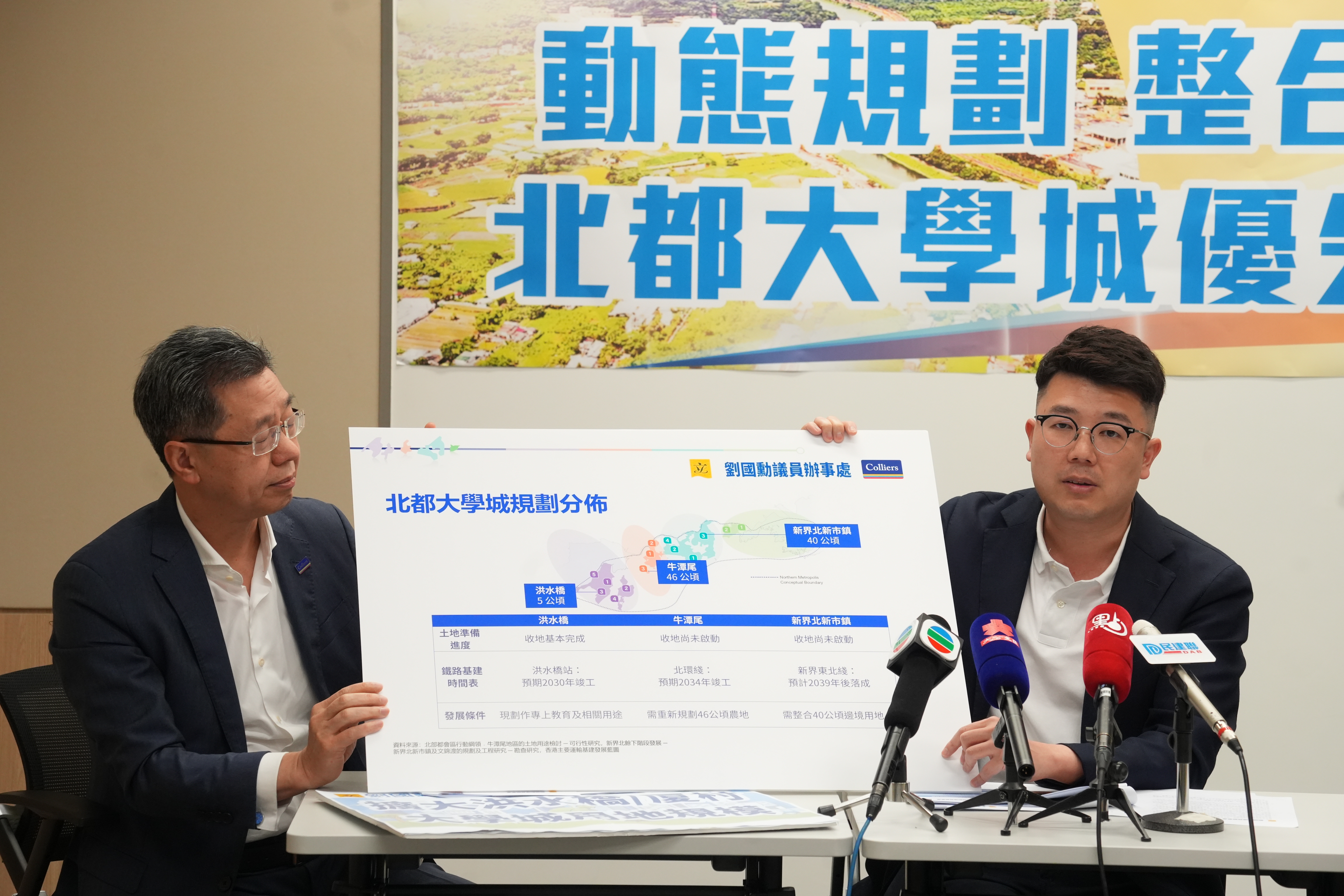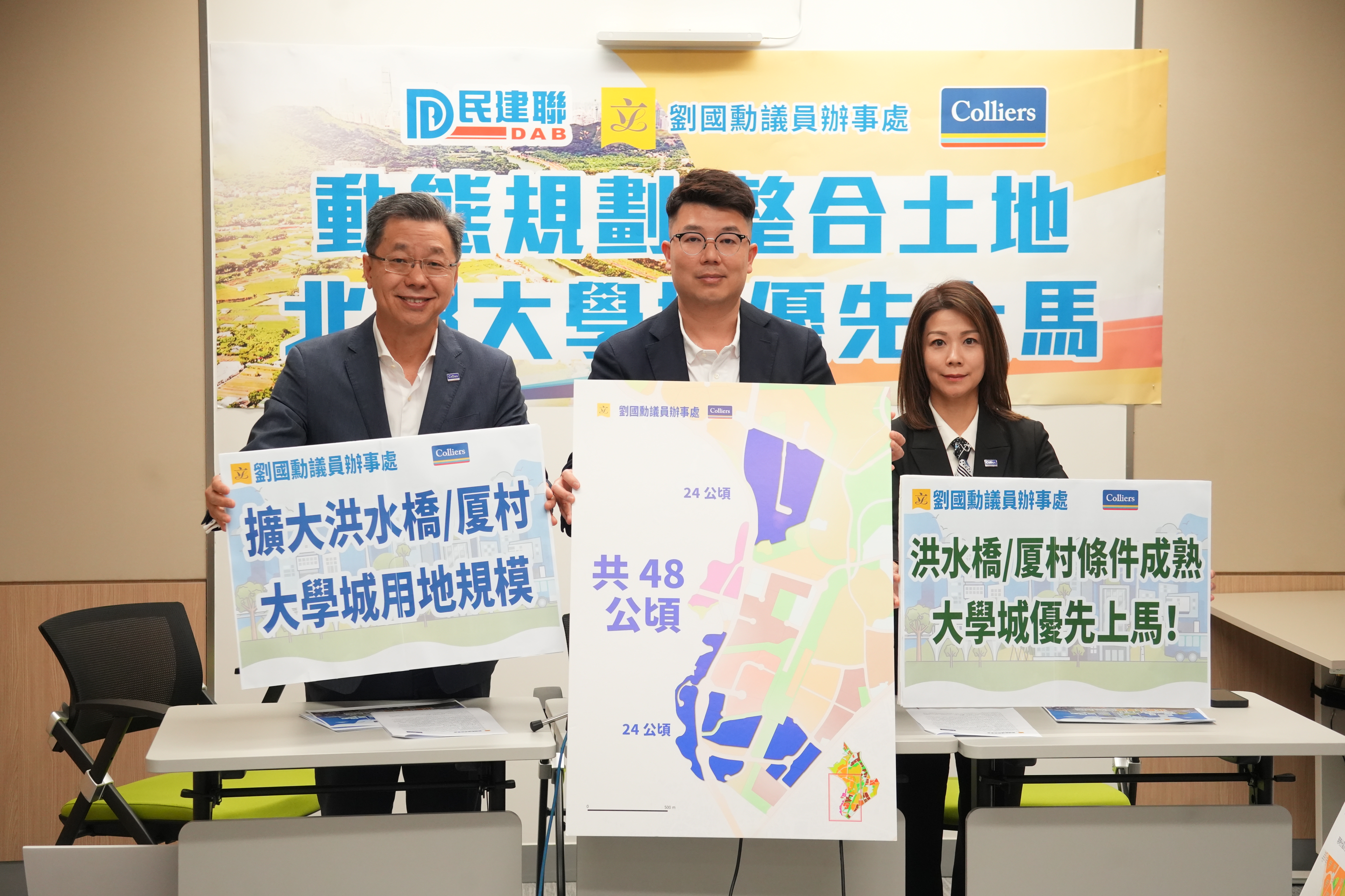 (大公文匯全媒體 記者 袁由)施政報告提出,在北都預留用地發展「北都大學教育城」分別分布於牛潭尾約46公頃、洪水橋/廈村新發展區佔約5公頃及新界北新市鎮佔約40公頃。民建聯立法會議員劉國勳今日(14日)聯同高力香港董事總經理劉振江、高力香港研究部及零售顧問主管李婉茵召開記者會,建議政府動態規劃和整合北部都會區土地,讓大學城項目能夠優先上馬。