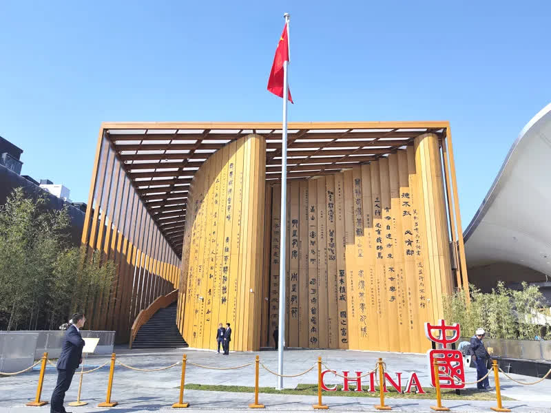 中國館佔地面積約3500平方米,是大阪世博會最大的外國自建館之一。展館以「中華書簡」為設計概念,外觀取形於中國傳統的書簡長卷,通過竹子、漢字、書卷三個主要元素,看上去彷彿是一座巨大的綿延展開的中華書簡,展示了「道法自然、天人合一」的中華文明精神標識和文化精髓,讓人一眼就能感受到強烈的中國元素和濃郁的文化氣息。