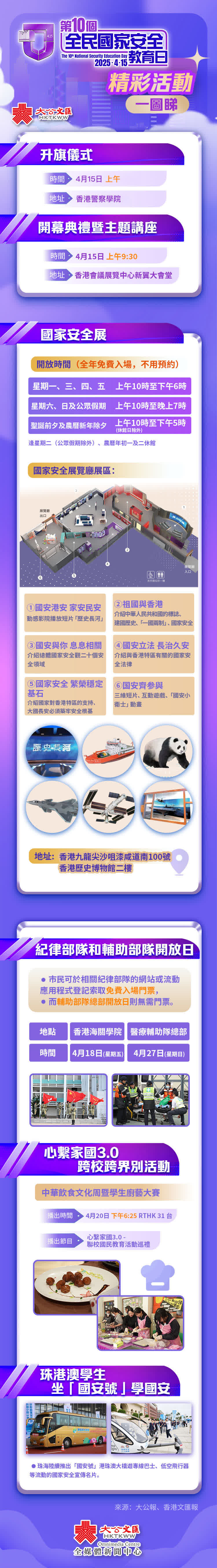 大公文匯全媒體報道,今年4月15日是第十個「全民國家安全教育日」,今年亦是全國人大常委會公布實施《香港國安法》五周年和《維護國家安全條例》立法生效一周年,意義重大。今年「全民國家安全教育日」都有哪些精彩活動?快來一圖睇清!