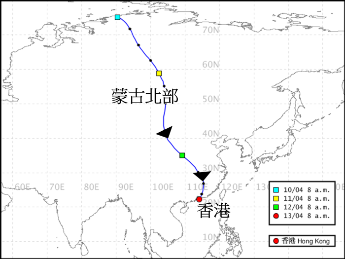 本港方面,4月12日晚上香港多處地區吹強風程度的北風,離岸及高地間中吹烈風,其中流浮山、西貢、赤鱲角錄得強風,而長洲、青洲、橫瀾島及大老山更錄得烈風,是次強烈東北季候風的風力強度在四月較為罕見。昨日(4月13日)本港能見度曾下降至6000米左右,而今日(4月14日)本港風勢較為微弱,能見度亦曾下降至5000米。