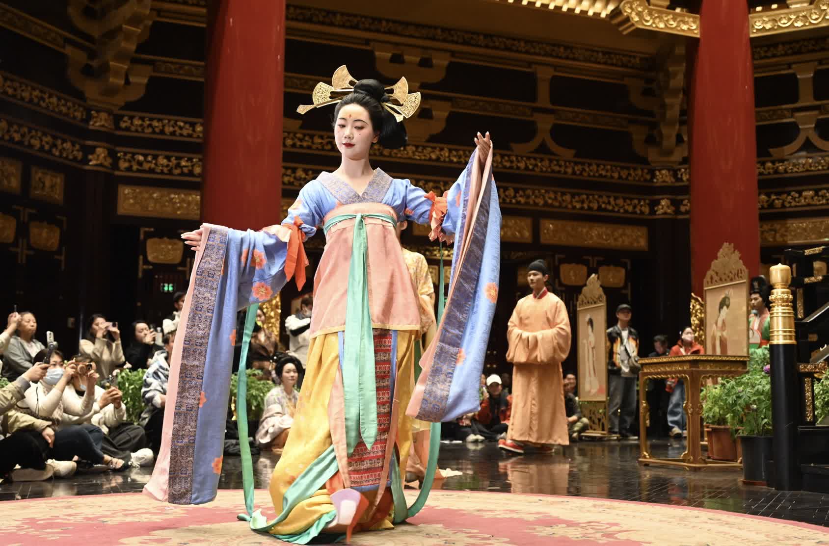 四十位模特化身歷史信使,身着自東漢至北宋的復原華服拾級而上,衣袂翩躚間,沉睡千年的壁畫彷彿破壁而出——東周禮樂的端雅、西漢雄渾的莊重、東漢儒風的飄逸,曹魏英武的肅穆、西晉名士的清骨,北魏胡漢的交融、北齊異域的瑰麗,隋代初綻的華貴、盛唐氣象的萬千,武周巾幗的颯爽、後梁煙華的短暫,後唐中興的豪情、後晉滄桑的輾轉,直至北宋文人的風雅,十三朝衣冠風華在洛陽城流轉生輝,織就一幅「衣冠上國」的立體長卷。