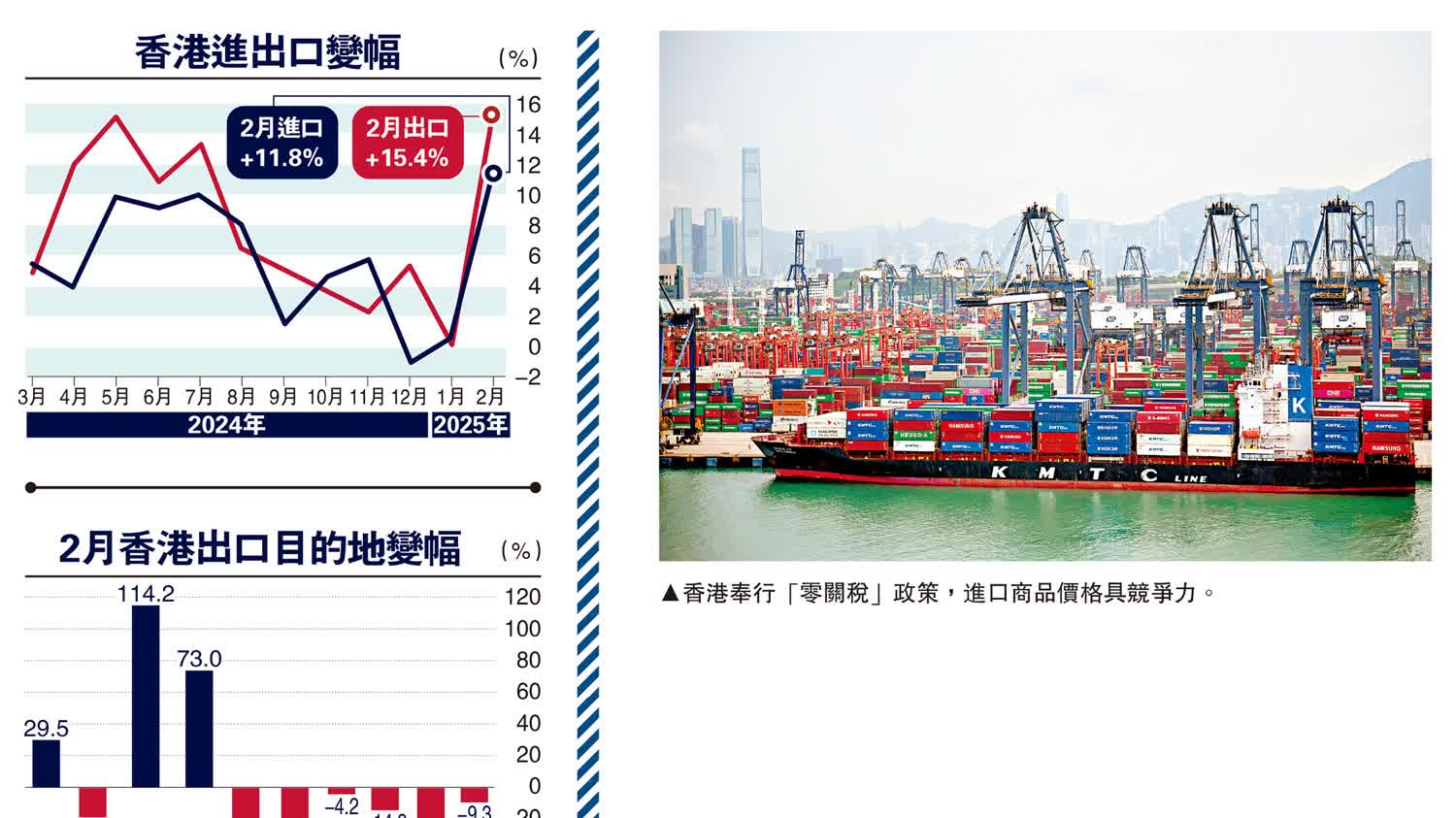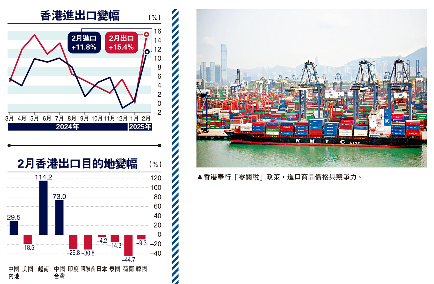 特區政府發言人指,香港商品出口今年年初繼續錄得穩健增長。美國至今推出的關稅措施,以及與保護政策相關的不確定性,將繼續對香港商品貿易表現構成挑戰,但隨着環球經濟,特別是內地經濟持續增長,將會為香港出口提供支持。
