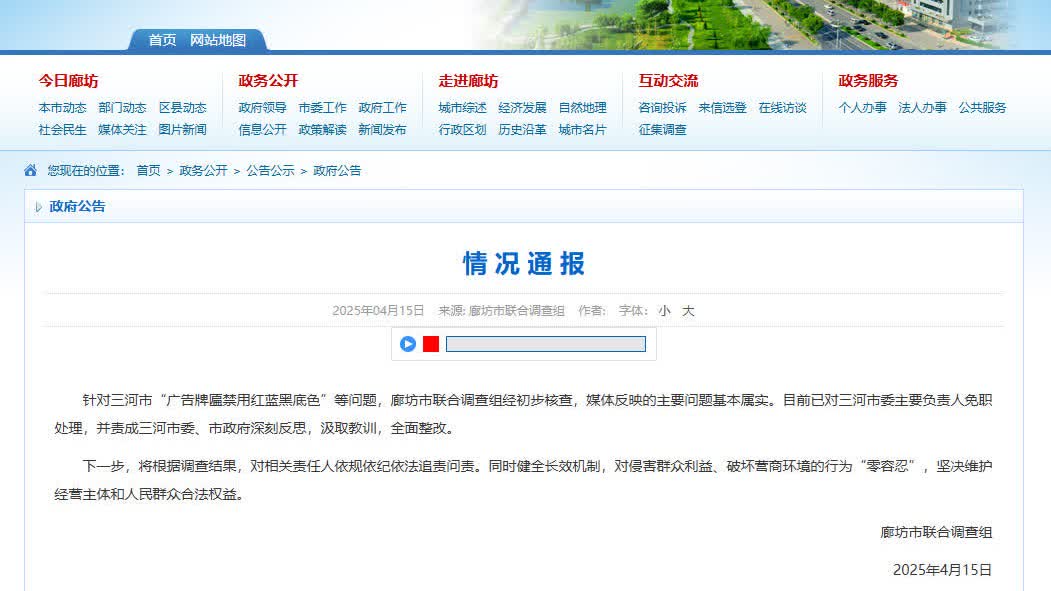 據廊坊市人民政府網站消息,針對三河市「廣告牌匾禁用紅藍黑底色」等問題,廊坊市聯合調查組經初步核查,媒體反映的主要問題基本屬實。目前已對三河市委主要負責人免職處理,並責成三河市委、市政府深刻反思,汲取教訓,全面整改。下一步,將根據調查結果,對相關責任人依規依紀依法追責問責。同時健全長效機制,對侵害群眾利益、破壞營商環境的行為「零容忍」,堅決維護經營主體和人民群眾合法權益。