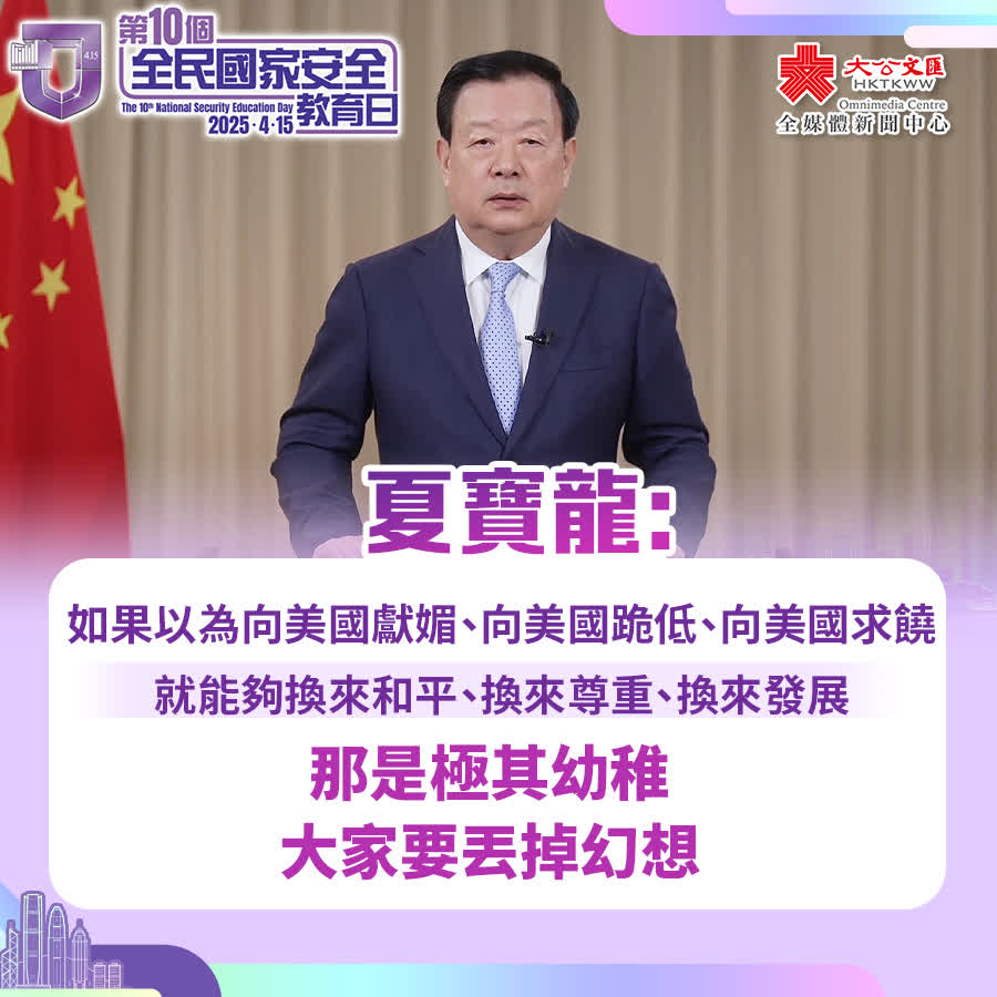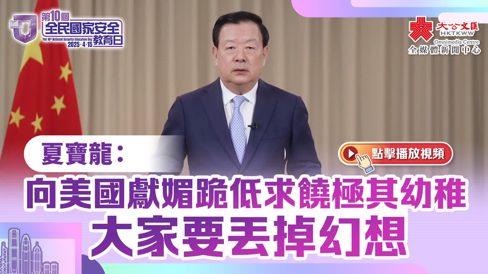 夏寶龍指出,現在我國作為世界第二大經濟體、第一大工業國,正昂首闊步踏上強國建設、民族復興的新征程。無論是關稅戰、貿易戰還是其他什麼戰,我們更加沒什麼好怕的,天塌不下來。如果以為向美國獻媚、向美國跪低、向美國求饒,就能夠換來和平、換來尊重、換來發展,那是極其幼稚。大家要丟掉幻想。美國所謂制裁和對等關稅撼動不了中央政府和香港特別行政區政府的決心意志,嚇不倒包括香港同胞在內的14億中國人民,只會讓我們更加堅定地團結在一起,更加堅定地維護國家安全和香港的繁榮穩定,勝利一定屬於偉大的中國人民。