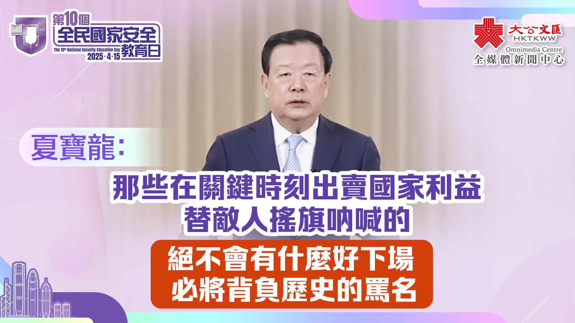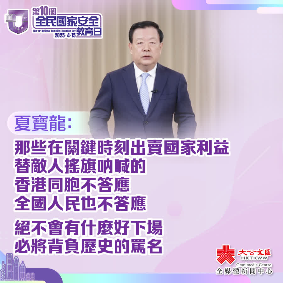 大公文匯全媒體報道,今日(4月15日)是第10個「全民國家安全教育日」,今年亦是全國人大常委會公布實施香港國安法五周年和《維護國家安全條例》立法生效一周年,意義重大。香港特別行政區維護國家安全委員會今日早上在香港會議展覽中心舉辦「全民國家安全教育日」開幕典禮暨主題講座。中央港澳工作辦公室主任、國務院港澳事務辦公室主任夏寶龍以視頻方式出席開幕典禮,並發表主旨講話。夏寶龍強調,那些在關鍵時刻出賣國家利益、替敵人搖旗吶喊的,香港同胞不答應,全國人民也不答應,絕不會有什麼好下場,必將背負歷史的罵名。