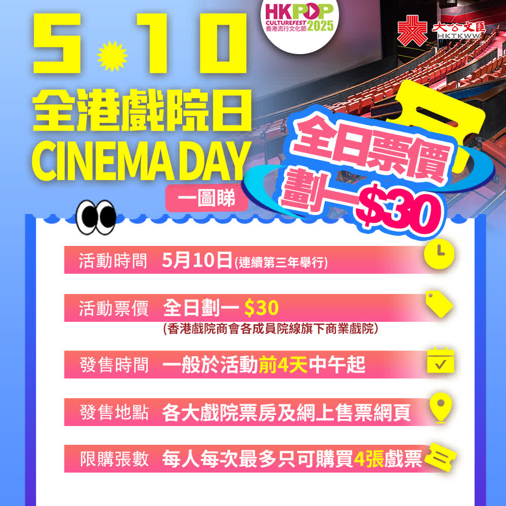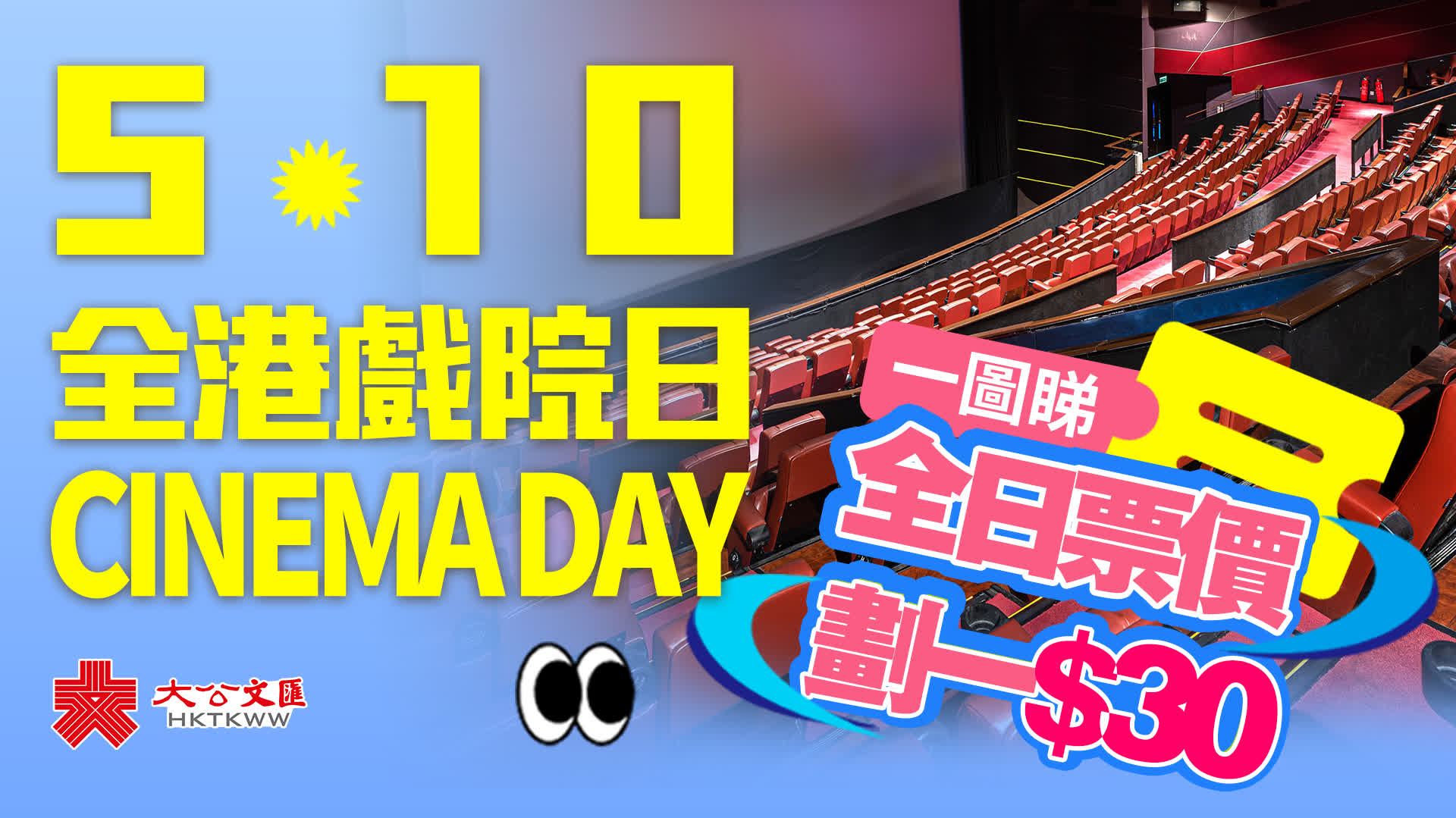 大公文匯全媒體報道,「全港戲院日」今年將連續第三年舉行,根據近日公布的宣傳片,2025「全港戲院日」將於5月10日(星期六)舉行,屆時香港戲院商會各成員院線旗下商業戲院提供全日劃一30元戲票。