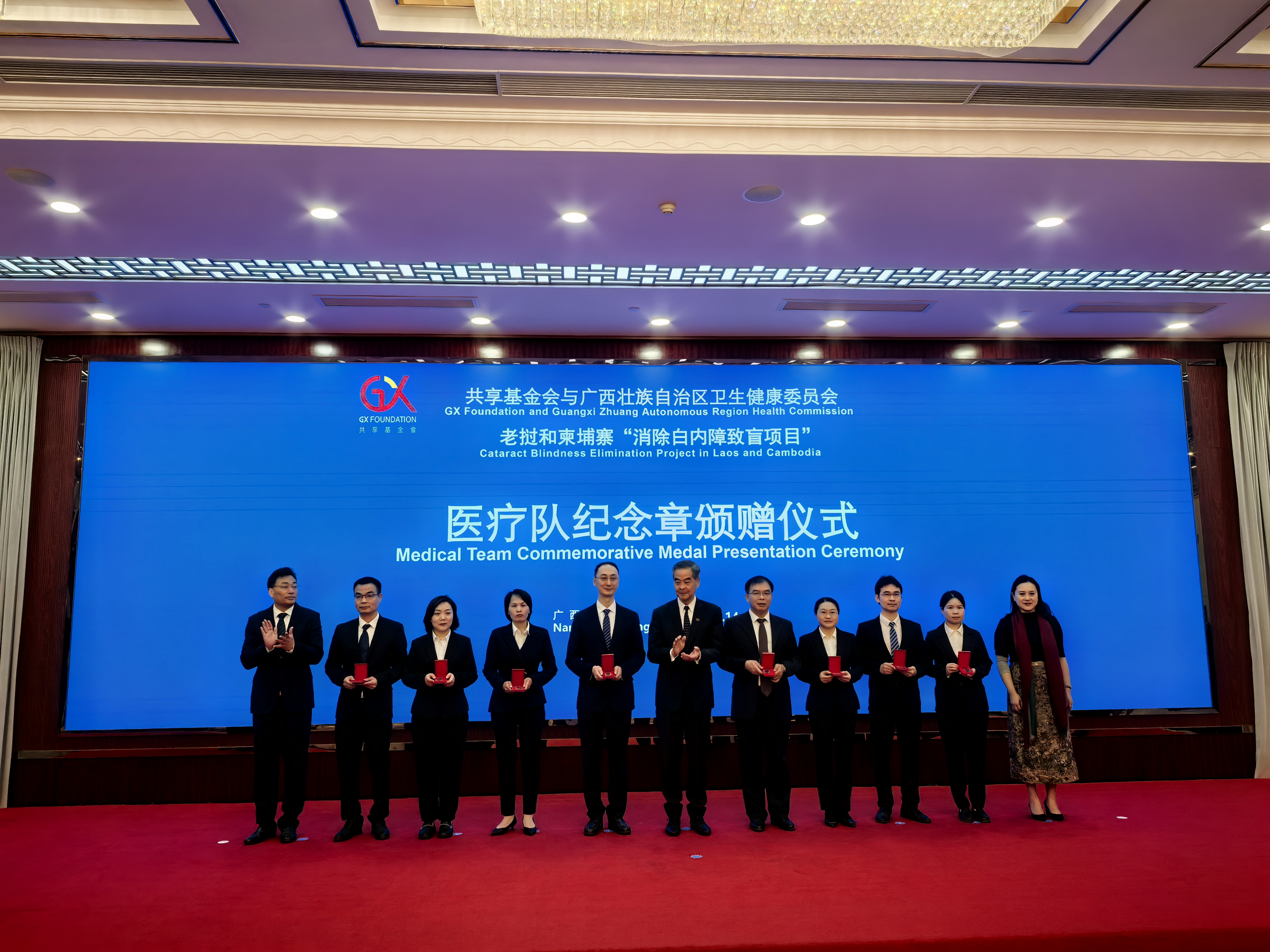 全國政協副主席、共享基金會主席梁振英親臨儀式現場,並向全體醫療隊員莊重頒贈紀念章。梁振英表示,援老撾、柬埔寨消除白內障致盲項目成果斐然,共順利完成10655例手術,約佔共享基金會全球項目的53%。醫療隊員們所付出的努力與奉獻,不僅深深感動了患者及其家屬,也打動了眾多捐贈者,其間湧現出無數感人至深的故事。「希望未來能夠進一步擴大和深化桂港在醫療衞生領域的合作,凝聚雙方力量,盡最大努力幫助發展中國家,為構建人類衞生健康共同體貢獻更為強大的力量。」