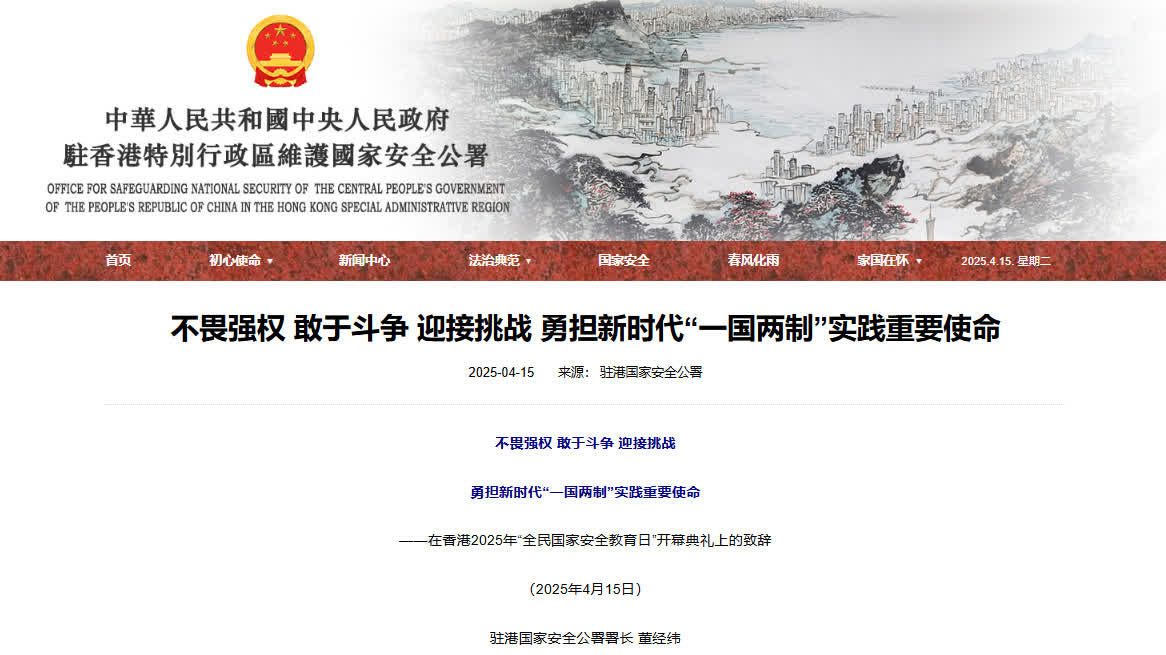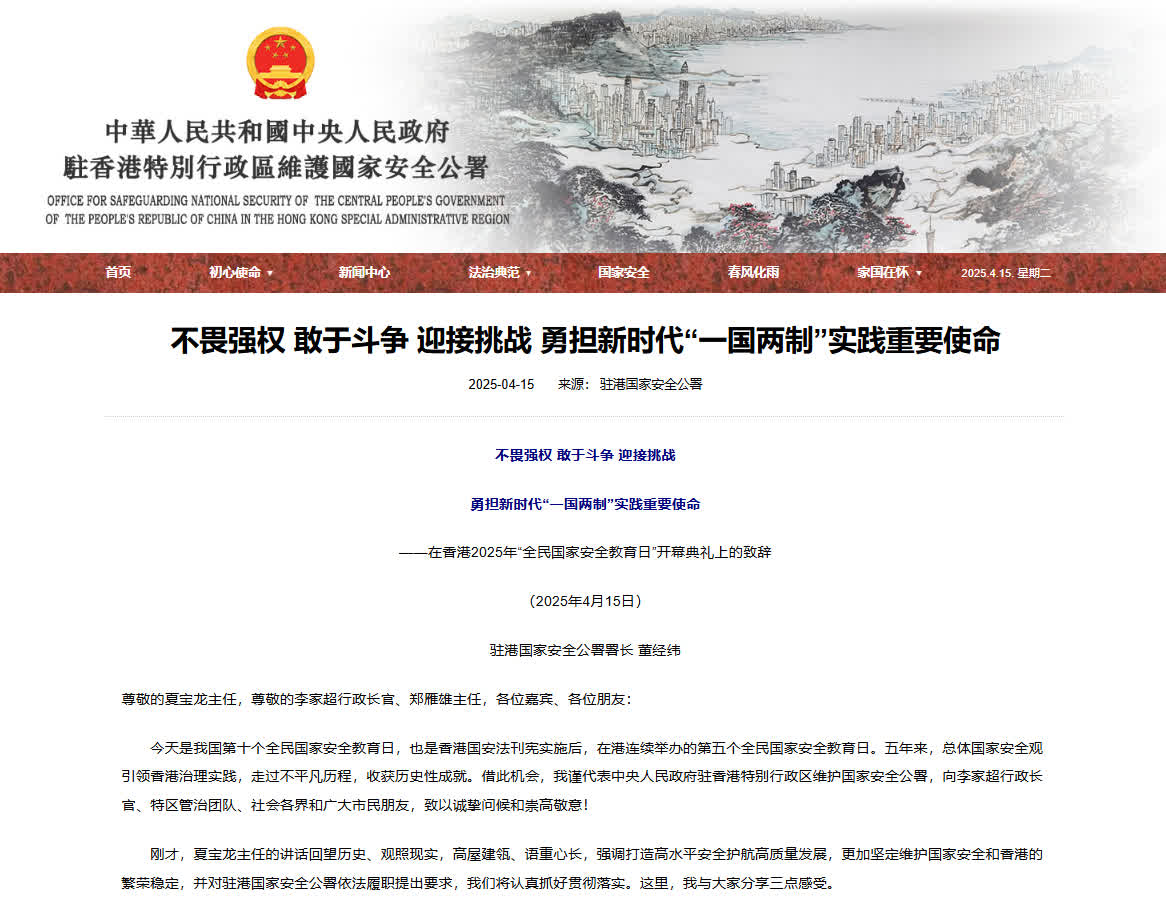 大公文匯網報道,據駐港國家安全公署消息,4月15日,在香港2025年「全民國家安全教育日」開幕典禮上,駐港國家安全公署署長董經緯發表題為《不畏強權 敢於鬥爭 迎接挑戰 勇擔新時代「一國兩制」實踐重要使命》的致辭。以下為致辭全文: