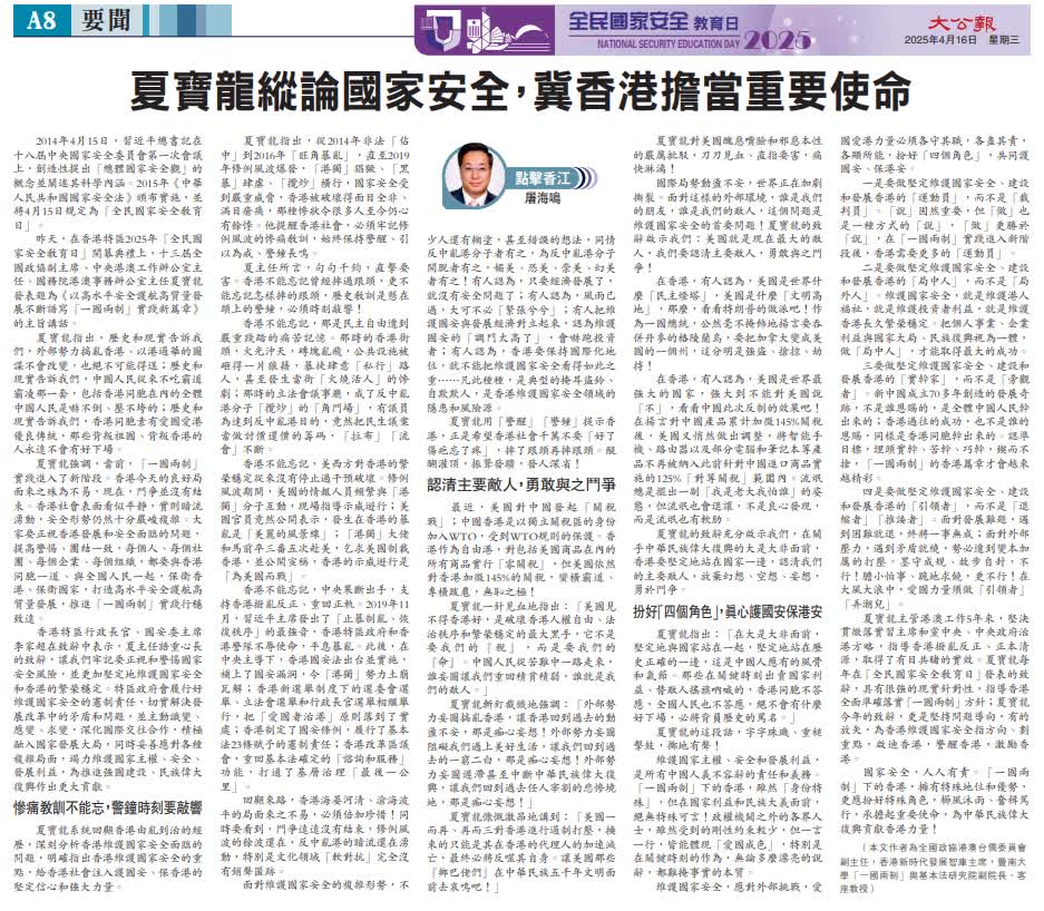 昨天,在香港特區2025年「全民國家安全教育日」開幕典禮上,十三屆全國政協副主席、中央港澳工作辦公室主任、國務院港澳事務辦公室主任夏寶龍發表題為《以高水平安全護航高質量發展不斷譜寫「一國兩制」實踐新篇章》的主旨講話。