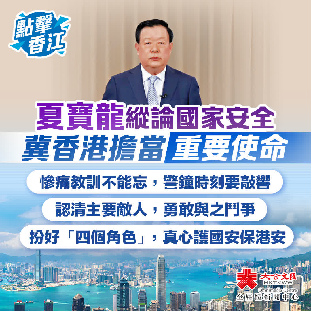 夏寶龍主管港澳工作5年來,堅決貫徹落實習主席和黨中央、中央政府治港方略,指導香港撥亂反正、正本清源,取得了有目共睹的實效。夏寶龍每年在「全民國家安全教育日」發表的致辭,具有很強的現實針對性,指導香港全面準確落實「一國兩制」方針;夏寶龍今年的致辭,更是堅持問題導向,有的放矢,為香港維護國家安全指方向、劃重點,啟迪香港,警醒香港,激勵香港。