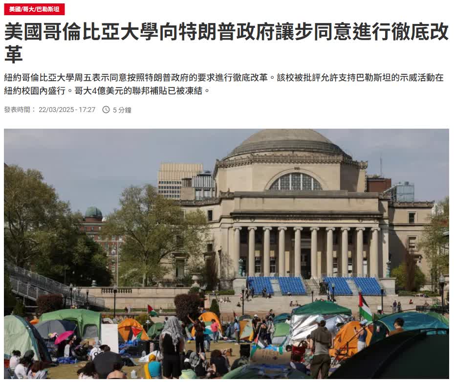 今年3月,紐約哥倫比亞大學同意按照特朗普政府的要求進行徹底改革。