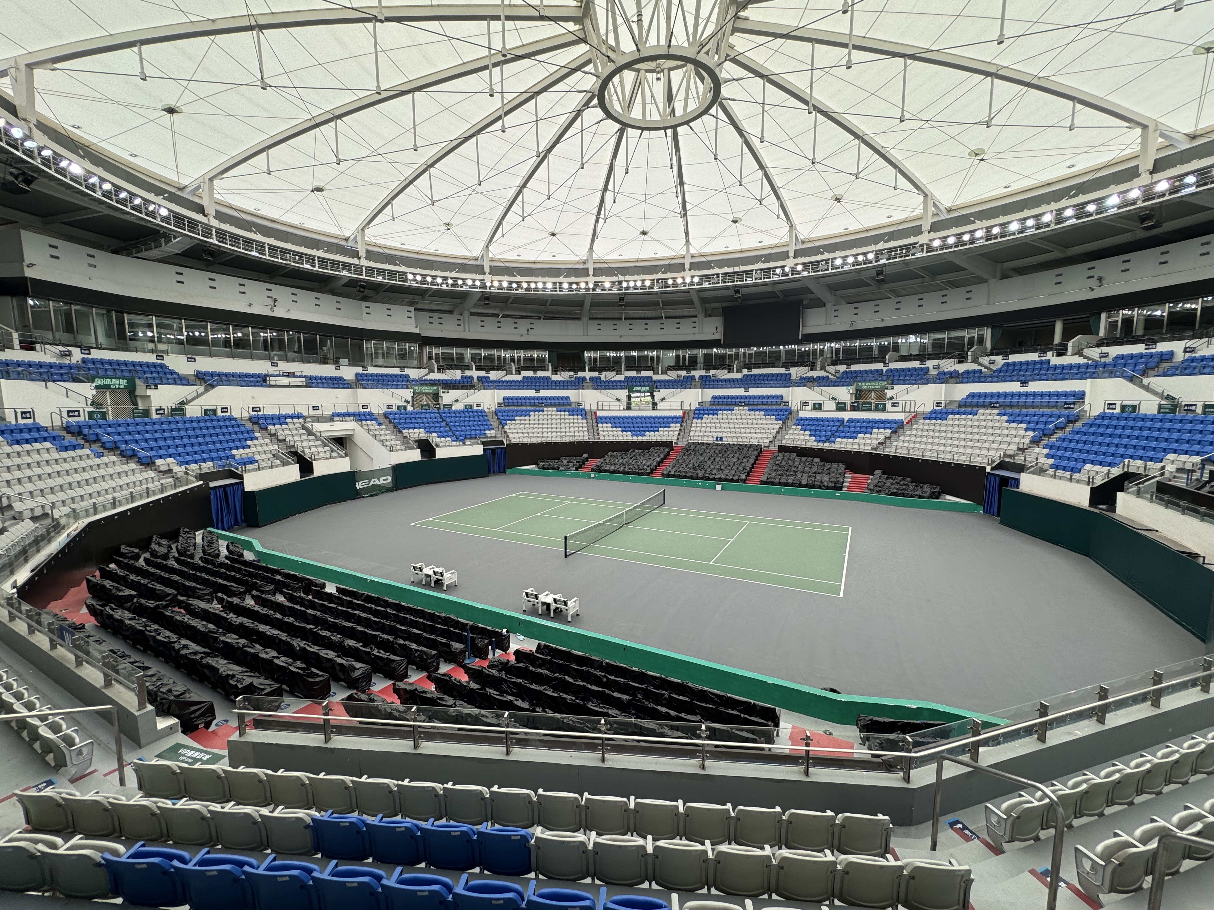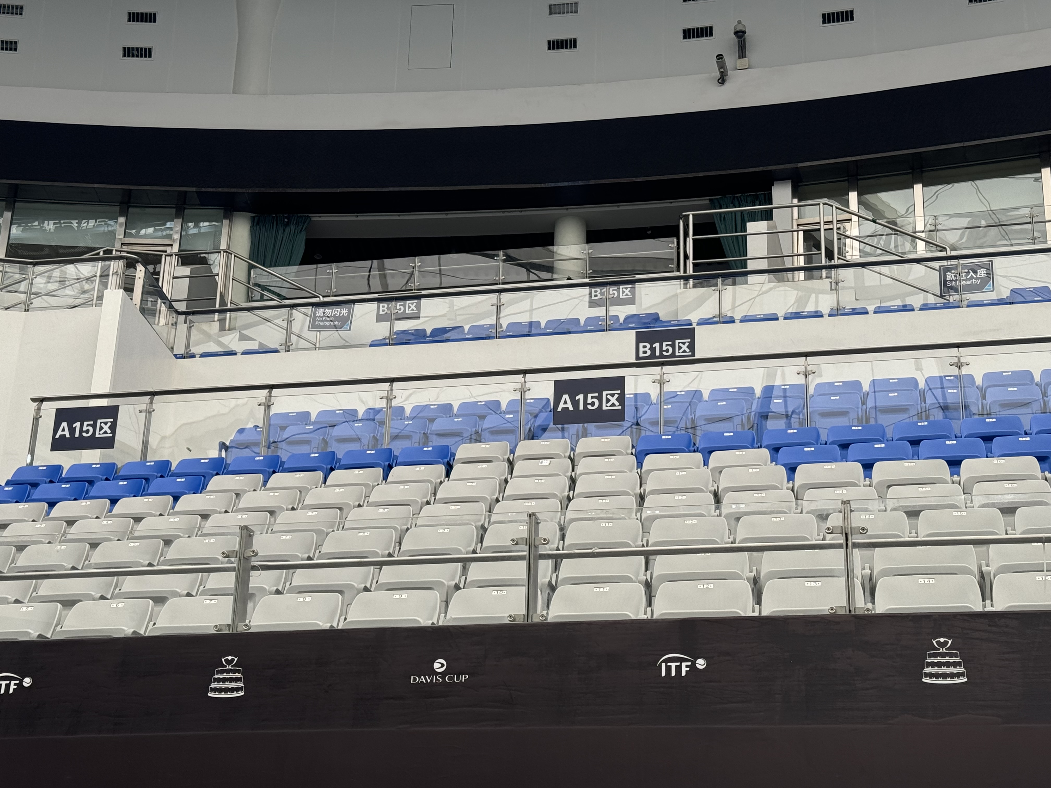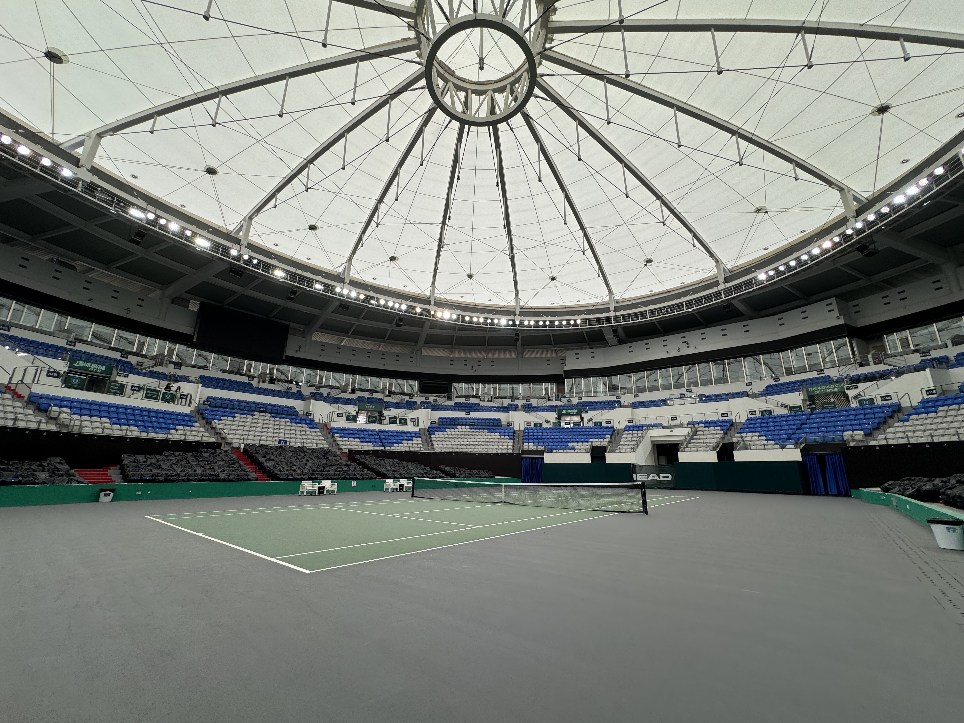 (大公文匯網記者 盧靜怡 珠海報道)隨着粵港澳三地首次聯合承辦的第十五屆全運會進入倒計時,「同心築夢・共謀發展」粵港澳媒體灣區行第三場聯合採訪活動採訪團探營多個「十五運」場地。14日,採訪團走進了橫琴國際網球中心。走進主場館,覆蓋在比賽場地上空的白色天幕穹頂最引人注目,觀眾席的座椅以藍白色為主調,視覺觀感清新宜人。記者看到,部分嶄新的座椅仍用幕布遮蓋,現場正加緊最後階段的收尾工作。