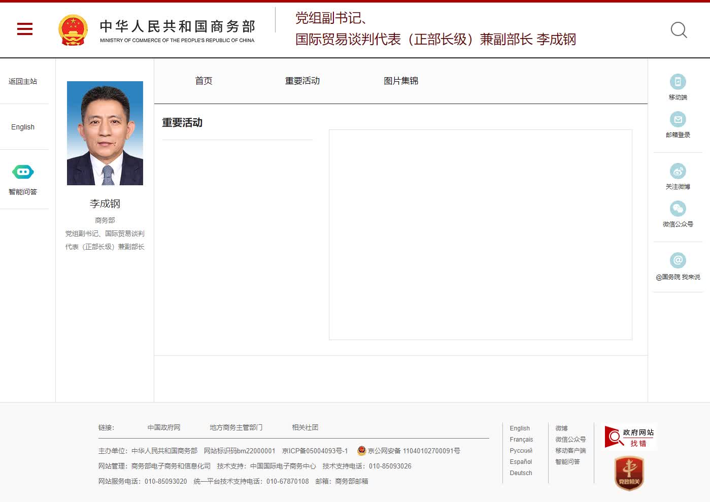 據商務部「機構設置」欄目顯示,李成鋼已任商務部黨組副書記、國際貿易談判代表(正部長級)兼副部長。