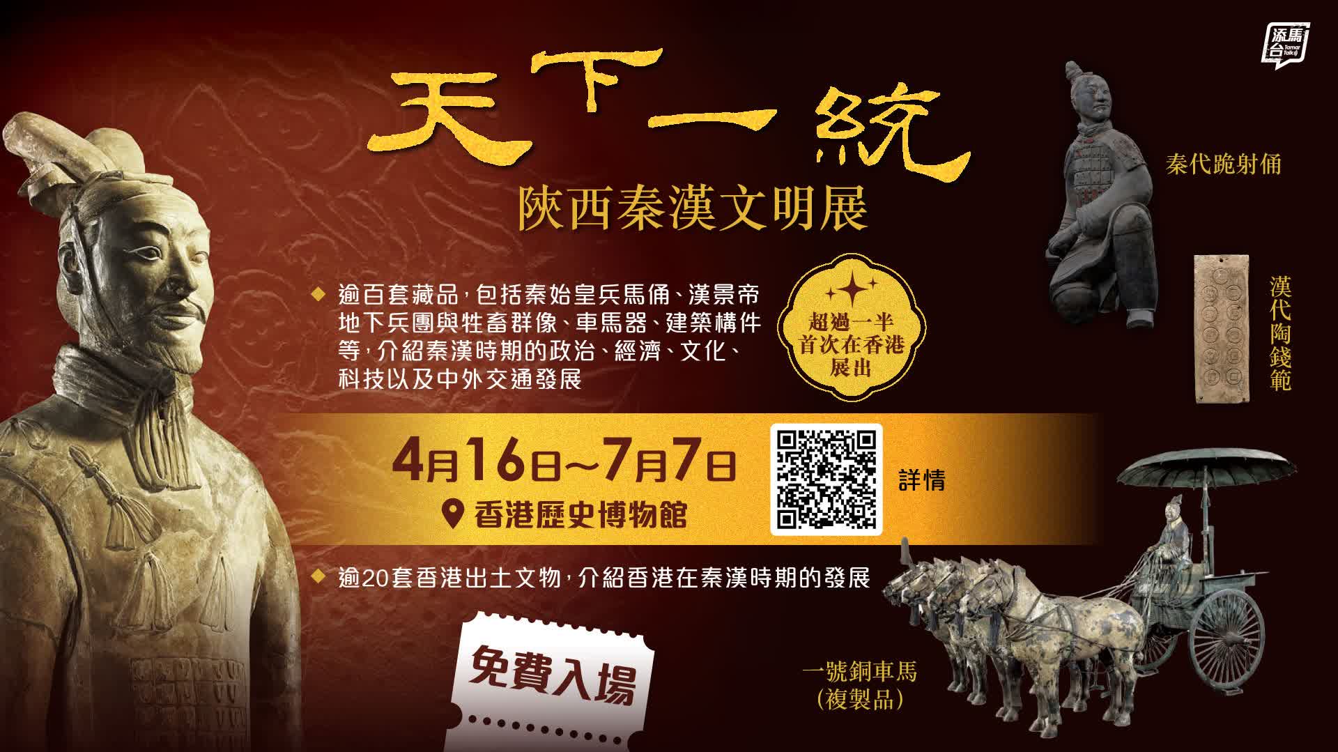 由今日(4月16日)起推出的「天下一統 — 陝西秦漢文明展」,讓觀眾一睹秦始皇兵馬俑、漢景帝地下兵團與牲畜群像、車馬器、建築構件等,了解當時的政治、經濟、文化、科技以及中外交通等發展,認識博大精深的中華文化。看圖了解詳情。