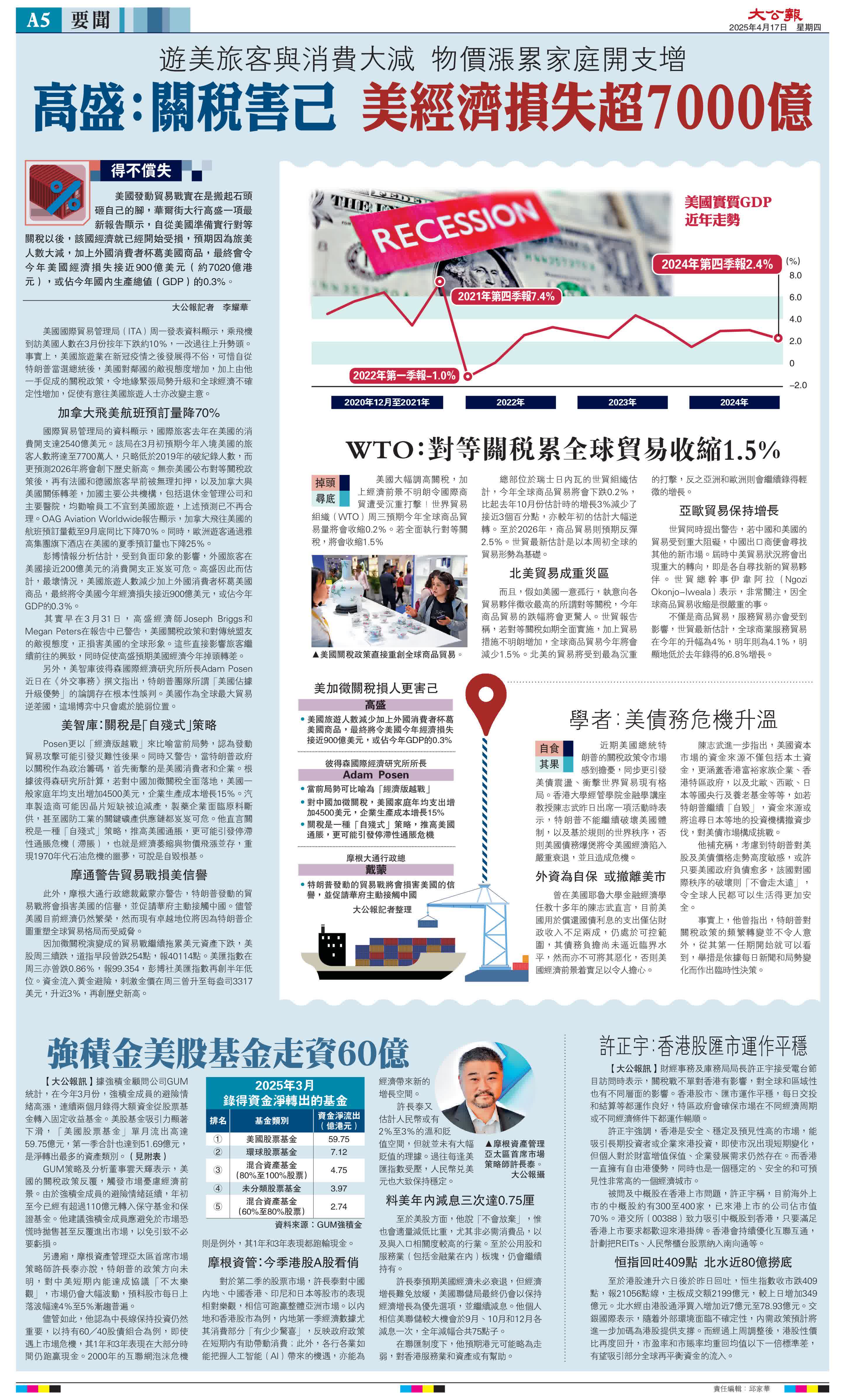 (大公報記者 李耀華)美國發動貿易戰實在是搬起石頭砸自己的腳,華爾街大行高盛一項最新報告顯示,自從美國準備實行對等關稅以後,該國經濟就已經開始受損,預期因為旅美人數大減,加上外國消費者杯葛美國商品,最終會令今年美國經濟損失接近900億美元(約7020億港元),或佔今年國內生產總值(GDP)的0.3%。