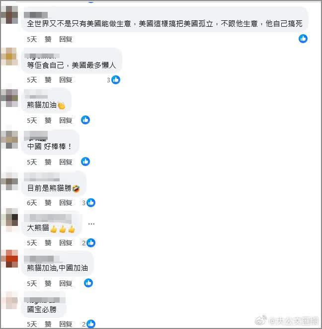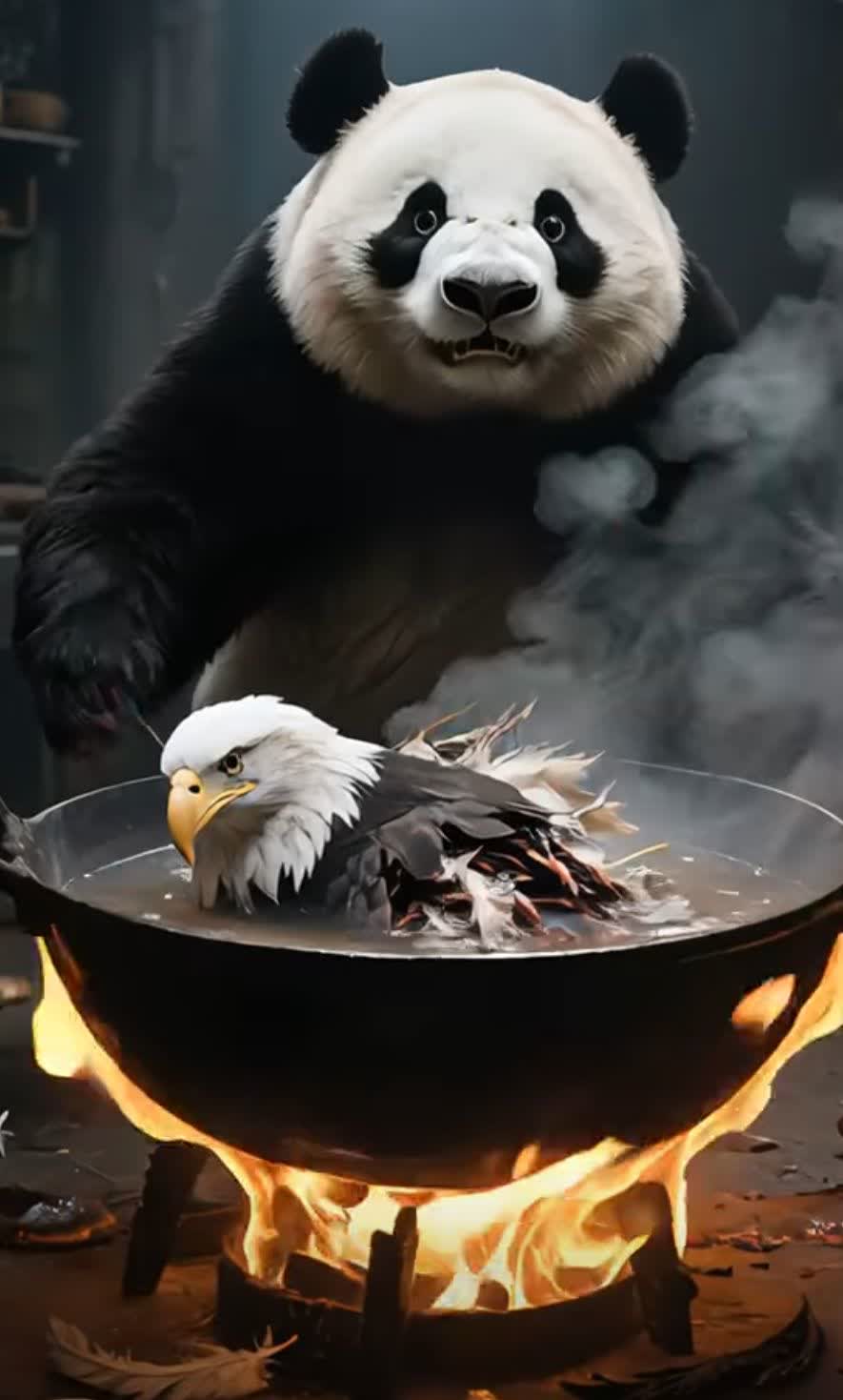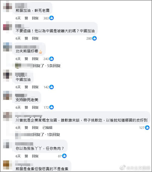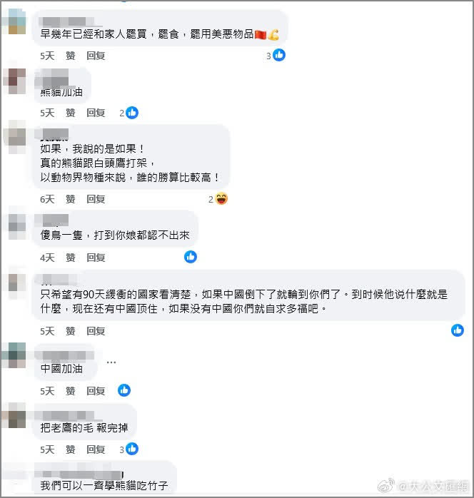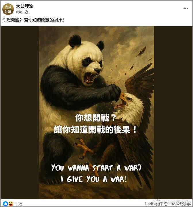 網友自製的圖片,「大熊貓燉老鷹」,排在評論區點讚第一位!