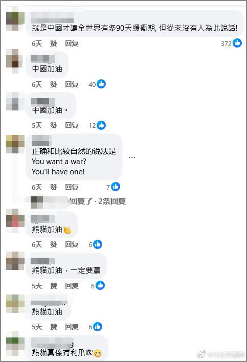 香港網友留言:「不要退縮!他以為中國是被嚇大的嗎?中國加油!」