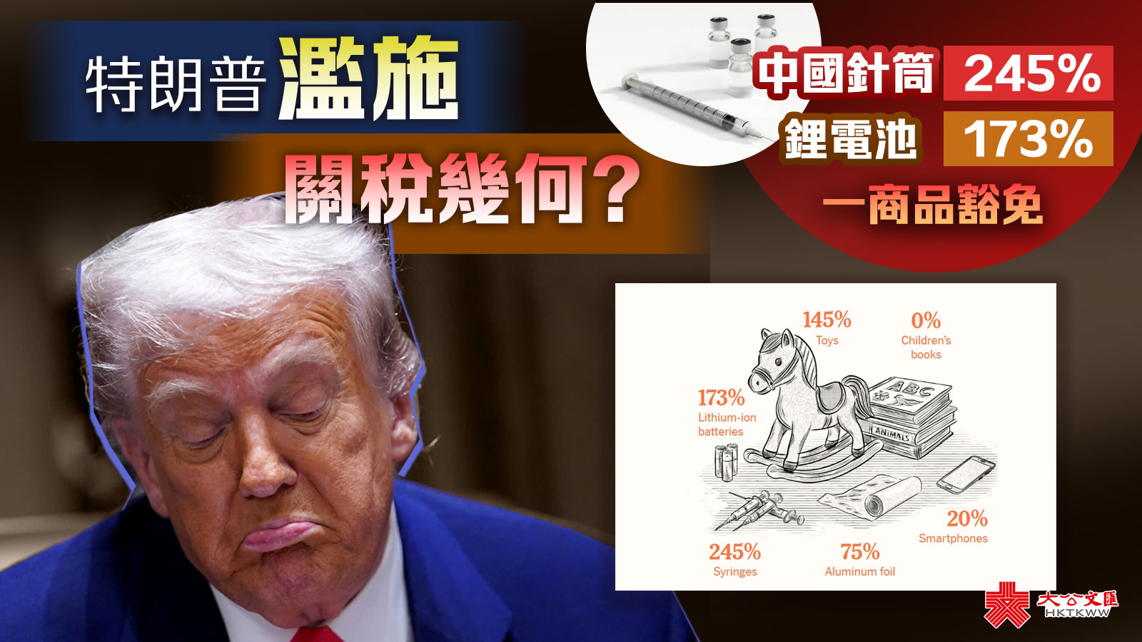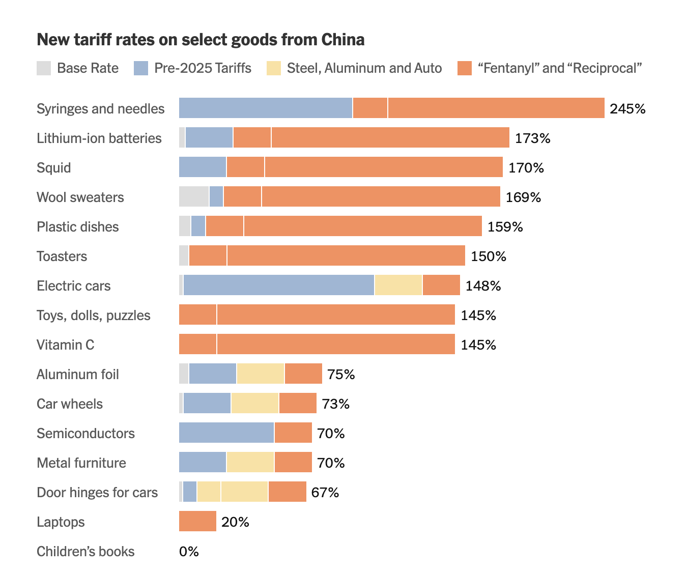 據《紐約時報》整理,包括針筒與針頭、鋰電池、玩具等中國製商品的進口稅率已飆升至歷史新高,其中針筒與針頭高達245%,鋰電池173%,兒童書籍作為少數被豁免的品項,仍可維持0%關稅。