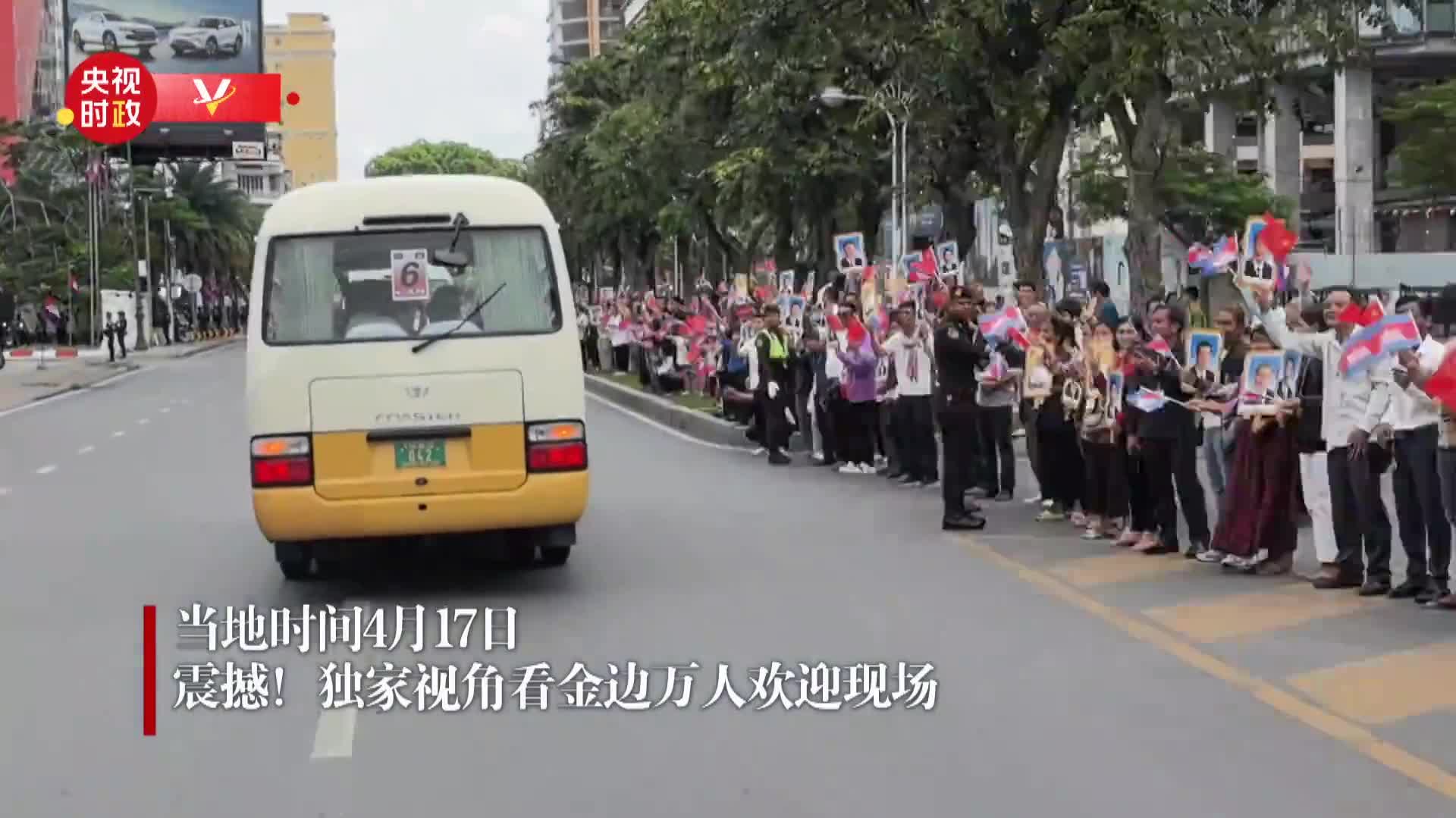 習近平乘車從機場赴下榻飯店途中,中柬兩國國旗迎風飄揚。兩萬餘名當地民眾以及華僑華人、中資企業和留學生代表簇擁在街道兩旁,揮舞中柬國旗,手持兩國領導人照片,熱烈歡迎習近平到訪。