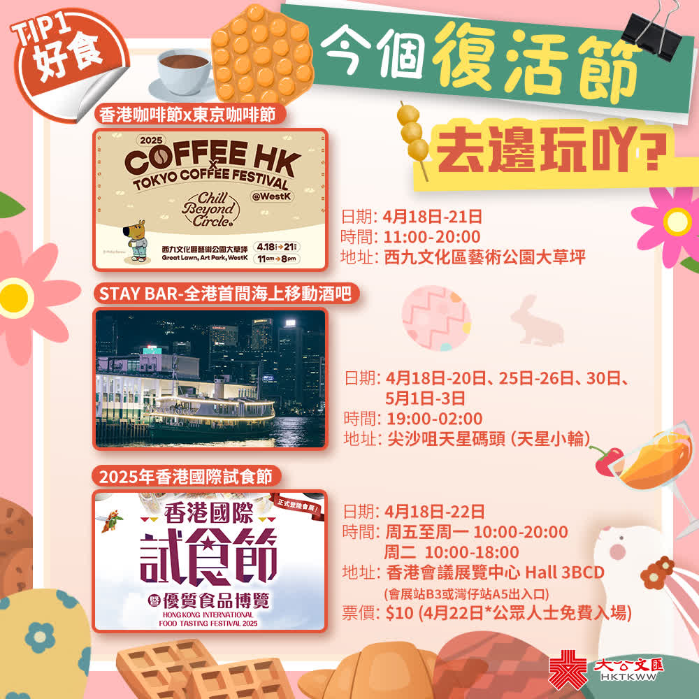 香港一連4日的復活節假期(4月18日至21日)正式開啟,你諗好去邊度玩未?大公文匯網為大家整理了復活節假期,香港多個好食、好睇、好玩的地方,助力大家過一個充滿活力與驚喜的繽紛假期!