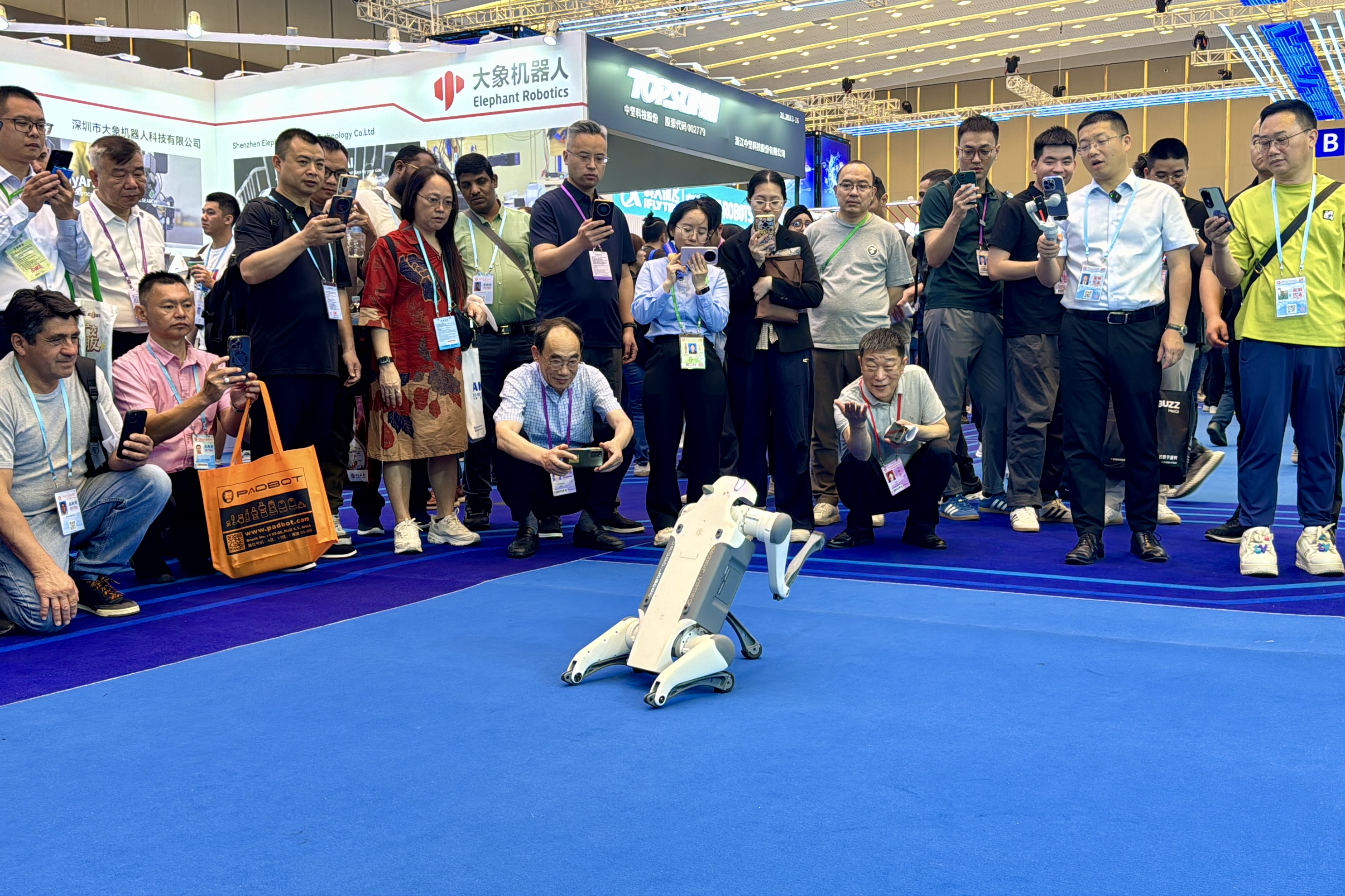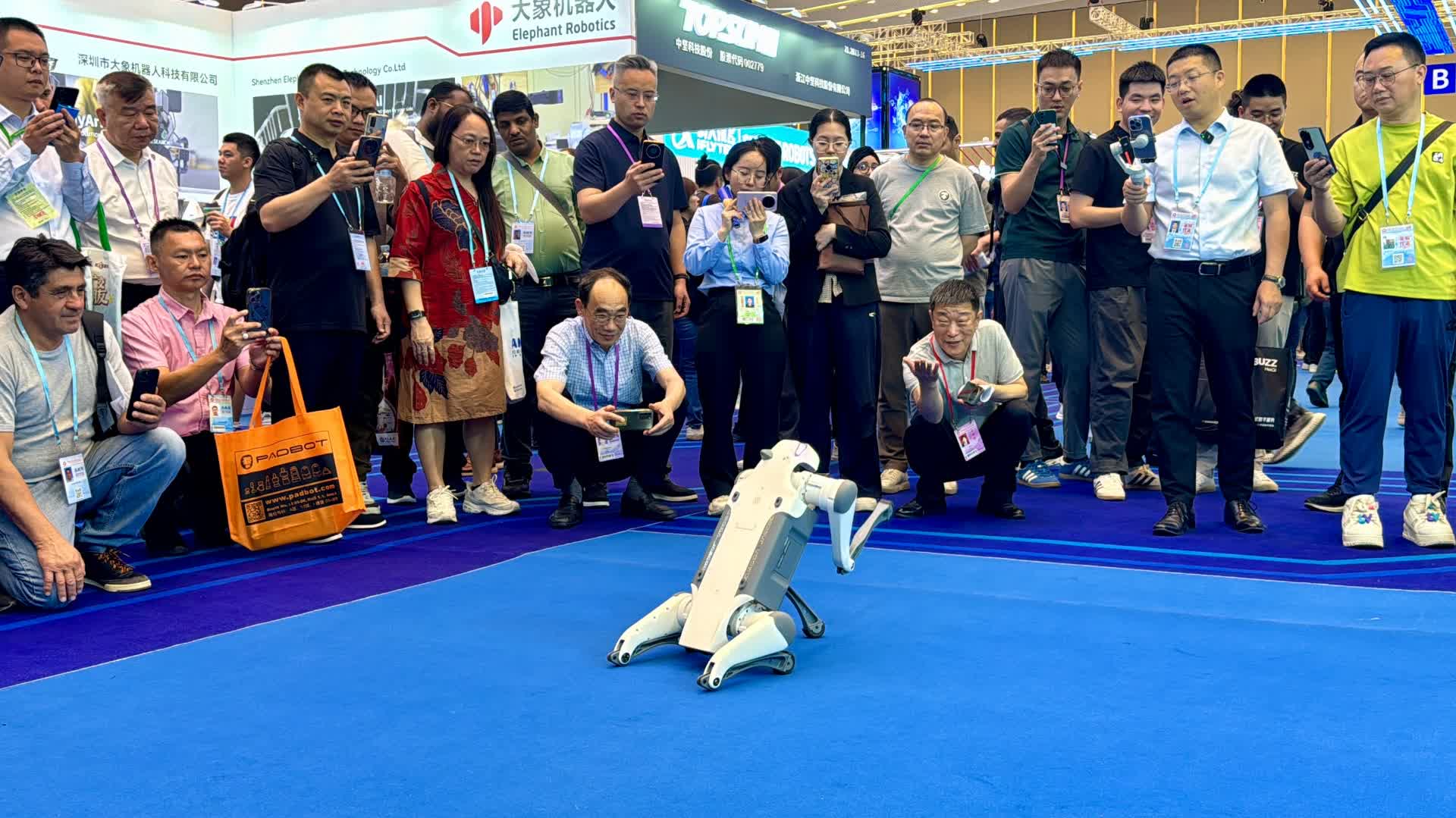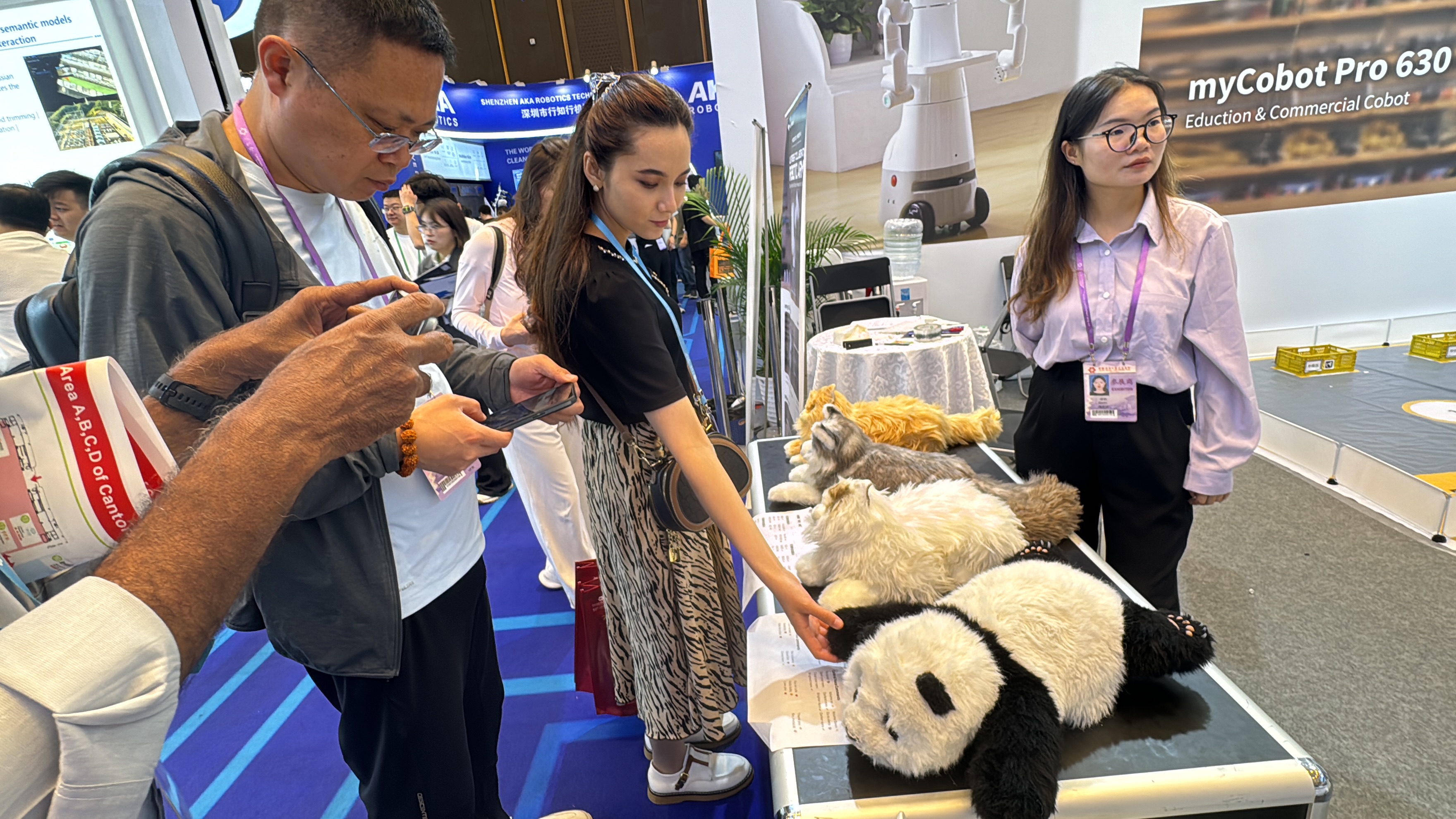 離它不遠,幾個機器狗靈活地跑上跑下,一會兒翻跟鬥、倒立,一會兒乖順地跪趴在參觀者面前,像招財貓似的搖起「前爪」,引得圍觀客商驚呼「amazing」!另外一個展位上,幾個毛茸茸的小貓、小狗、「大熊貓」造型的寵物機器人栩栩如生,萌化全場,工作人員說,幾乎每一個路過的客商、展商都要摸上一把,很多人愛不釋手、當場問價。