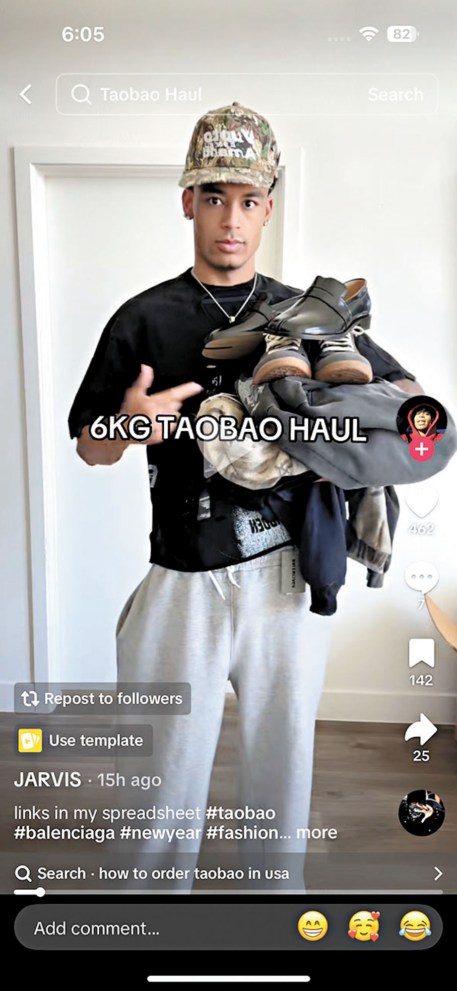 美國社交媒體上,「How to order taobao in USA」成為熱搜,不少淘寶商家也感受到了這波「潑天的流量」,服飾行業、3C數碼行業的部分店舖訪問量暴漲1,000%。在Tik Tok上,越來越多的美國時尚博主開始分享他們的「淘寶購物戰利品」,掀起了一股「中國製造」的熱潮。從oversize衛衣、潮流運動褲、復古皮鞋,到設計感十足的配飾,這些博主展示的商品不僅款式新穎、質量上乘,價格更是令人瞠目結舌——相比美國本土的零售價,淘寶上的同類產品往往便宜80%至90%。