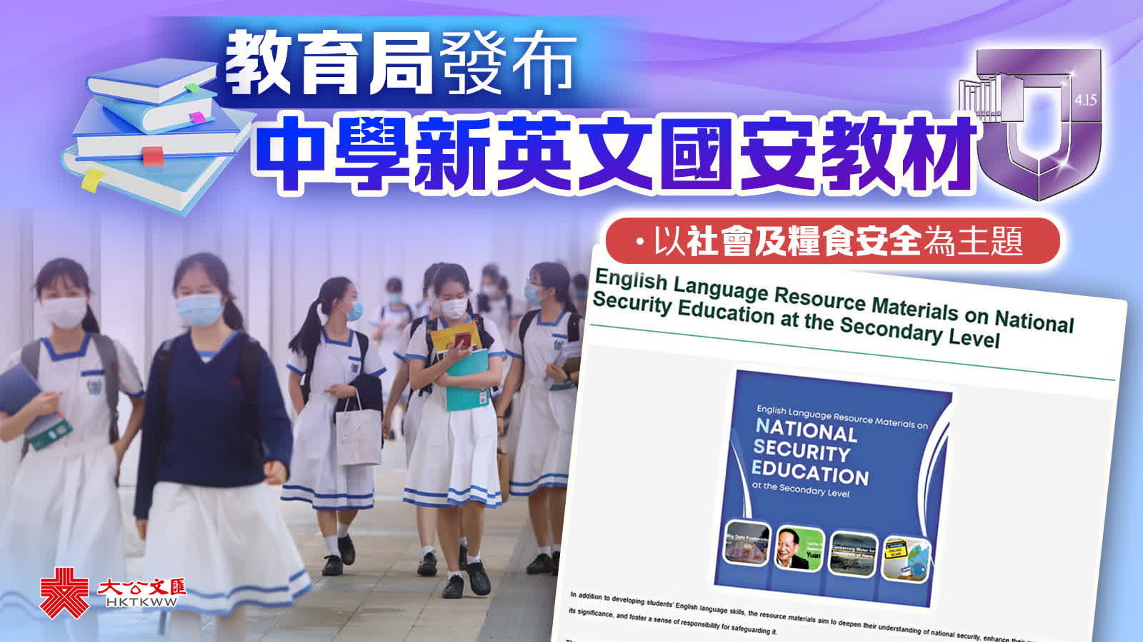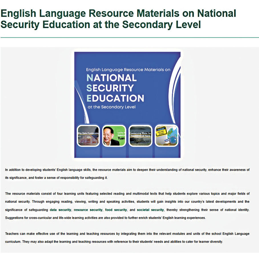 (香港文匯報記者 姬文風)國家安全教育是價值觀教育的重要一環,亦與國民教育密不可分,是本港學校課程的重要部分。為支援學校在英文科課程以自然聯繫、有機結合方式推行國安教育,讓中小學生既可提升英語能力,同時認識維護國家安全的重要性,特區政府教育局近日發布新一輯的中學英文科國安教育教材。該教材由四個學習單元組成,幫助學生了解國家的最新發展,以及維護數據安全、資源安全、糧食安全和社會安全的重要意義,從而增強國家認同感,並進一步豐富學生的英語學習經驗。