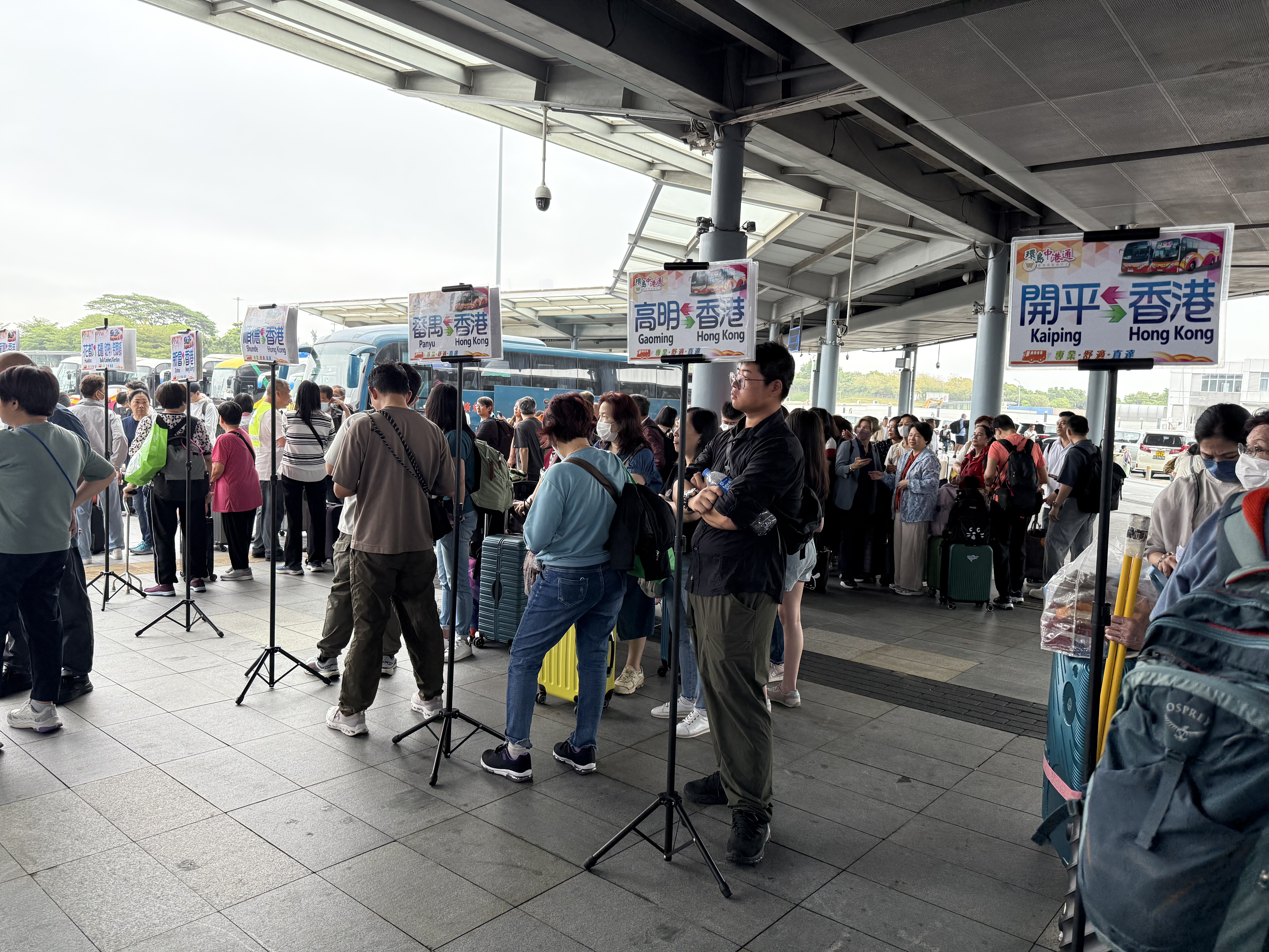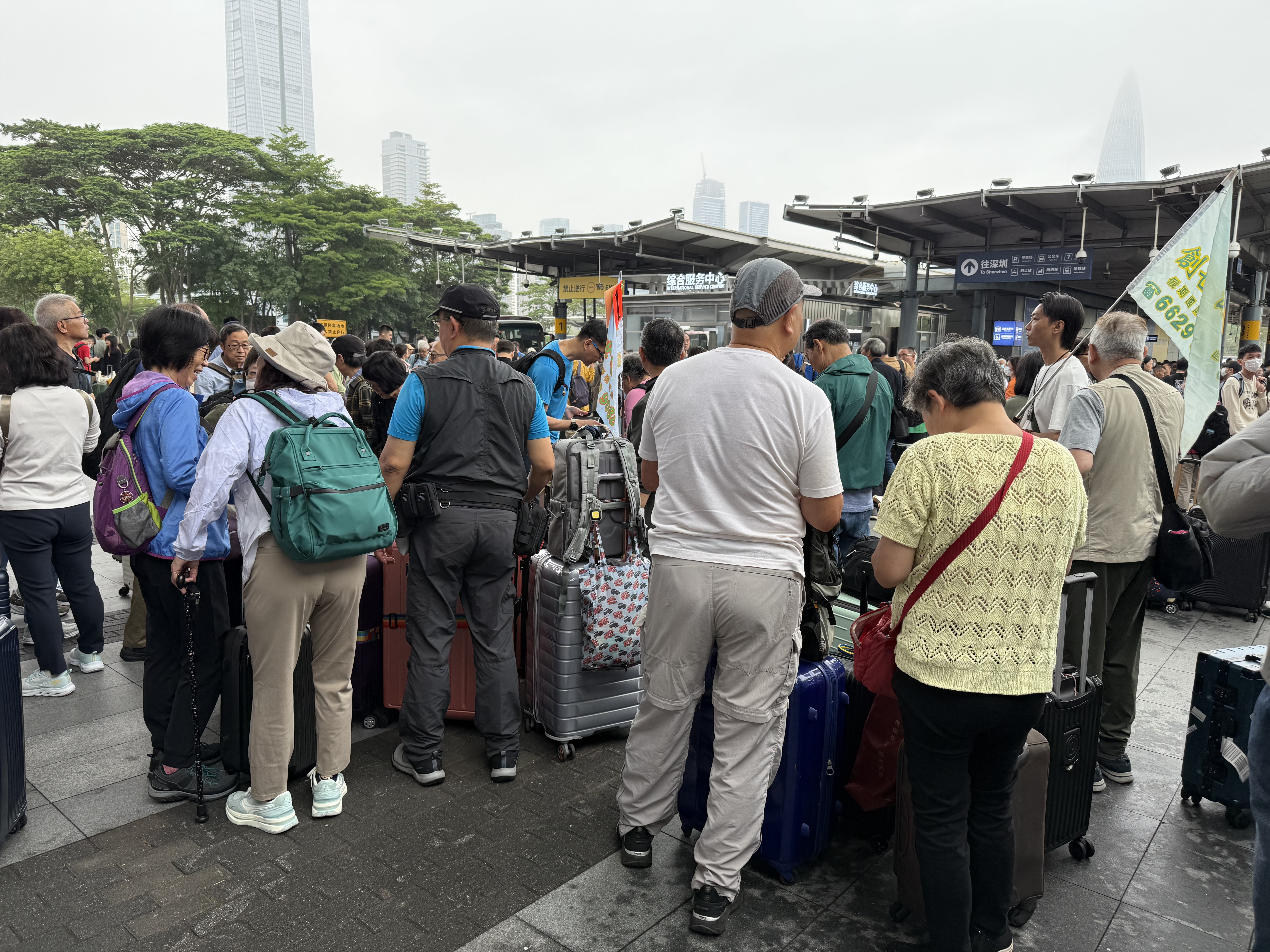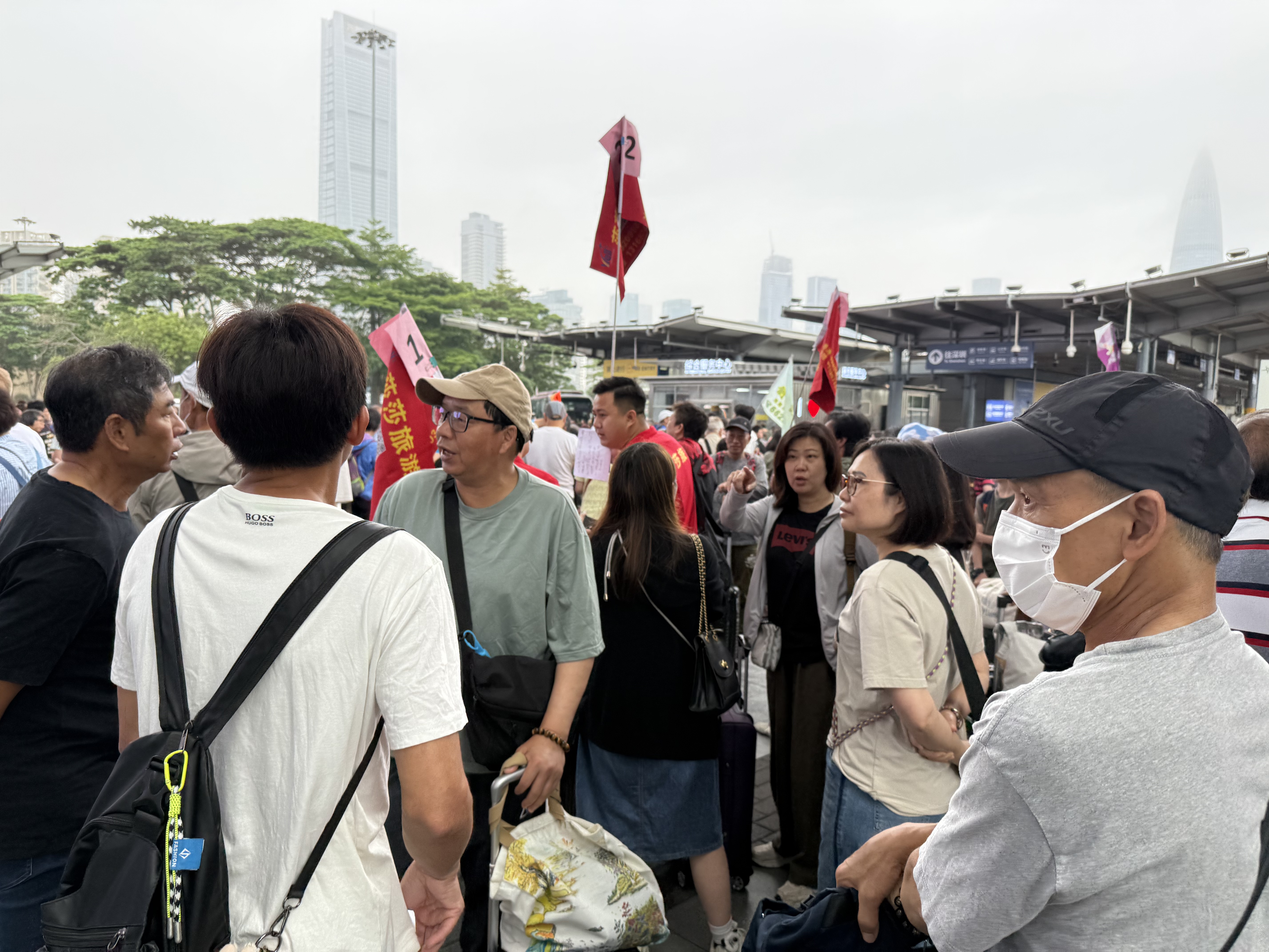 入境深圳後,赴廣東省內各城市的巴士站點都大排長龍。現場有多家旅行社等待從香港來的團友集合,其中大部分為短線遊。