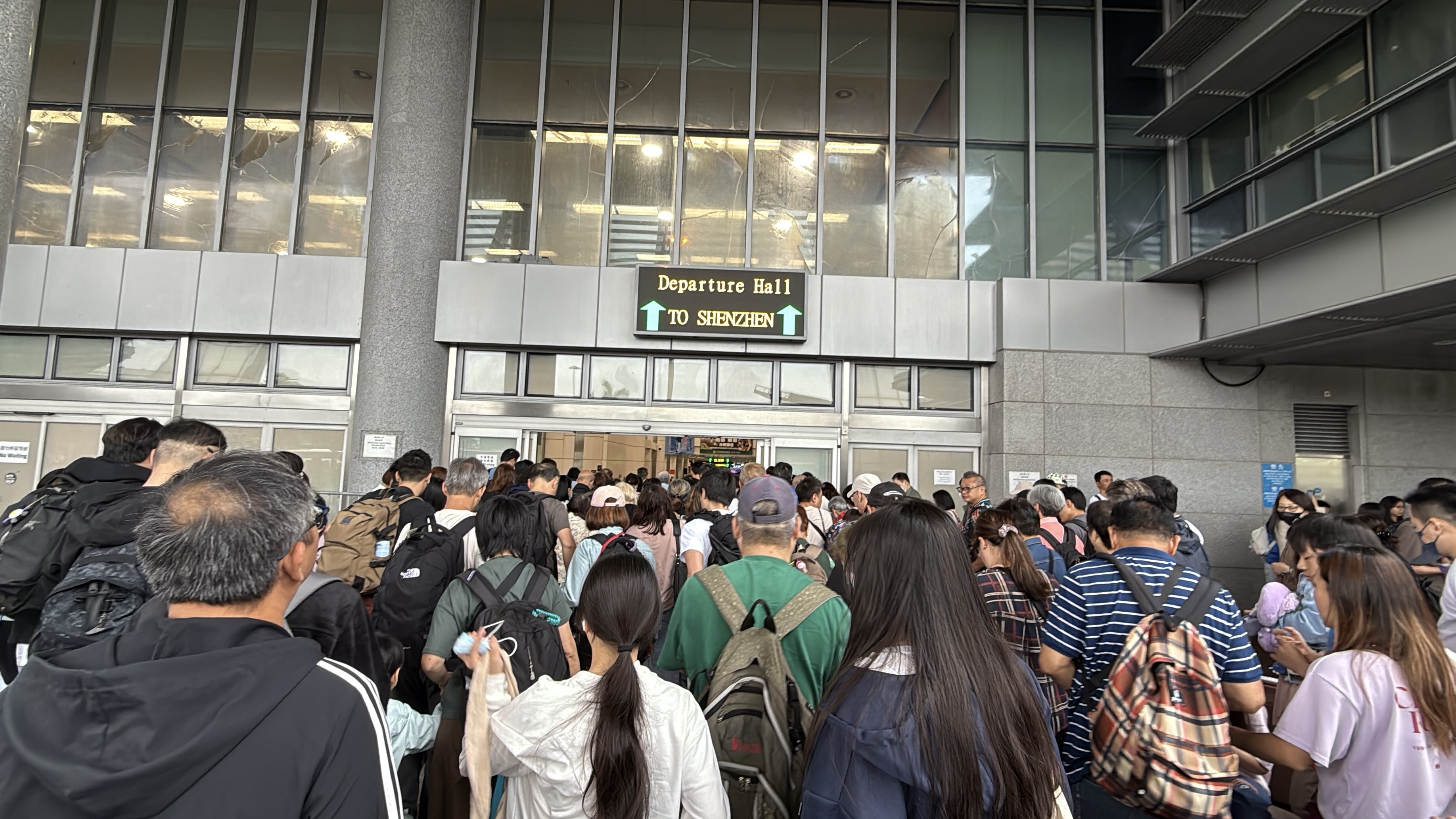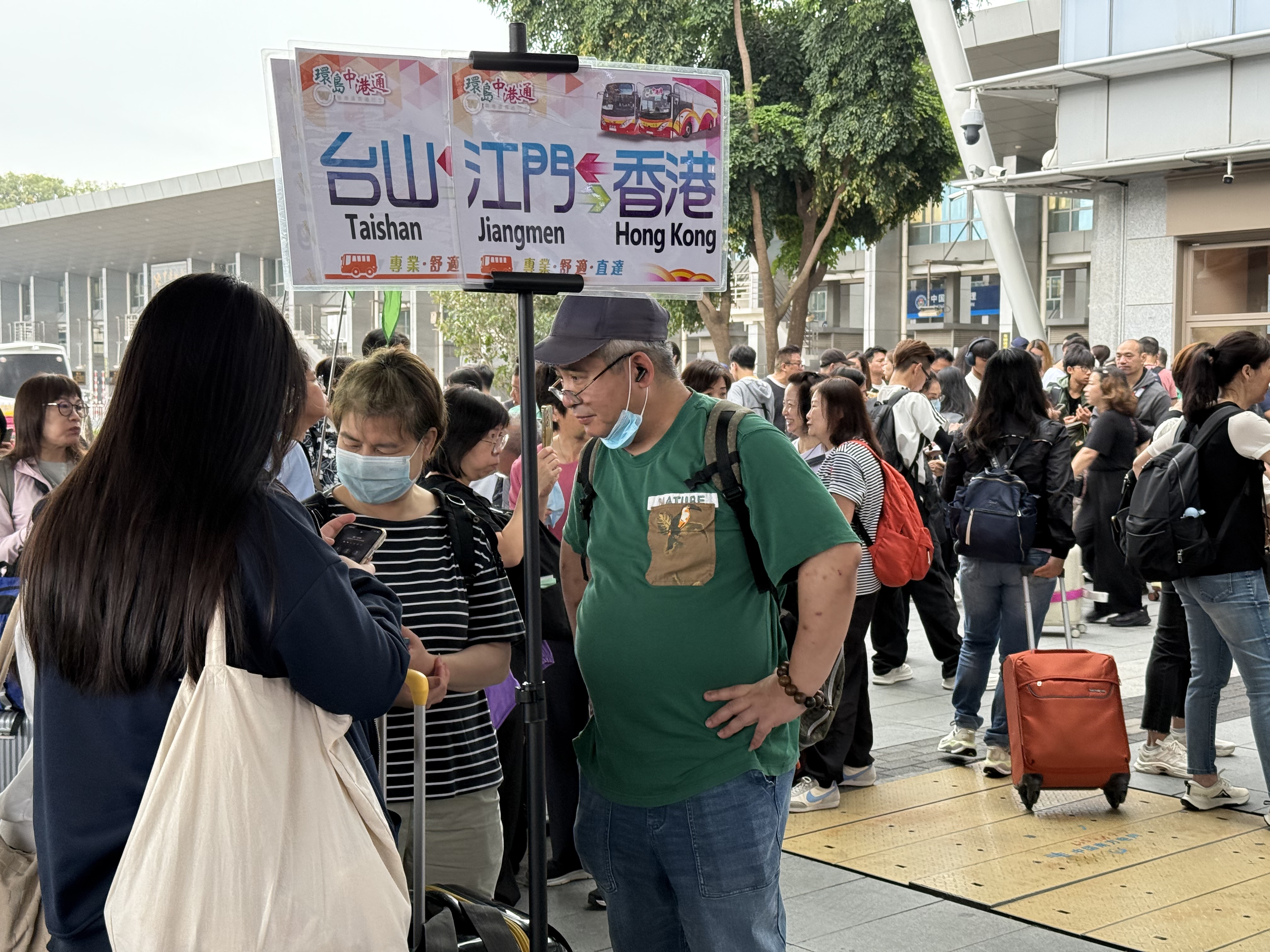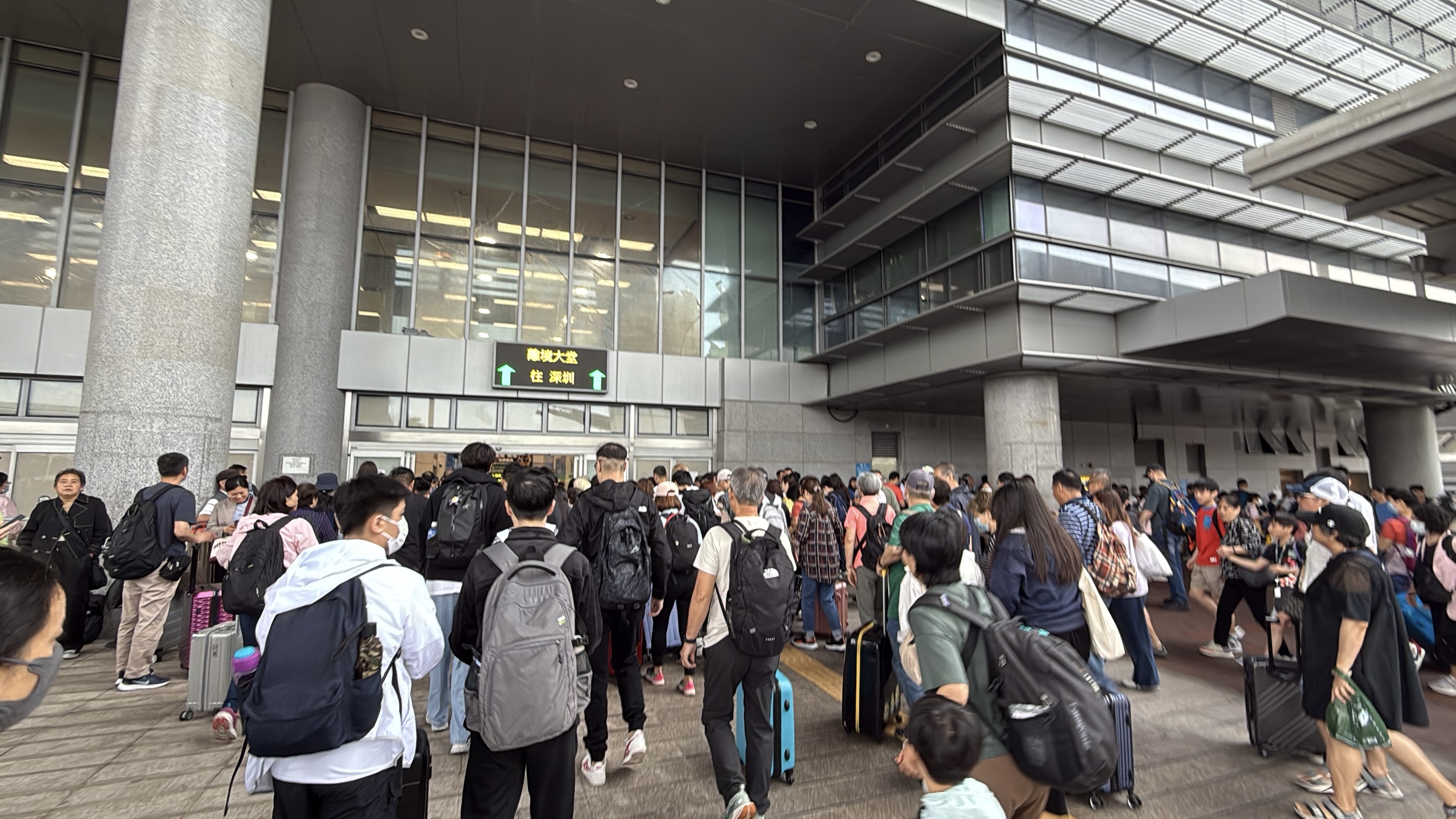 入境深圳後,赴廣東省內各城市的巴士站點都大排長龍。現場有多家旅行社等待從香港來的團友集合,其中大部分為短線遊。
