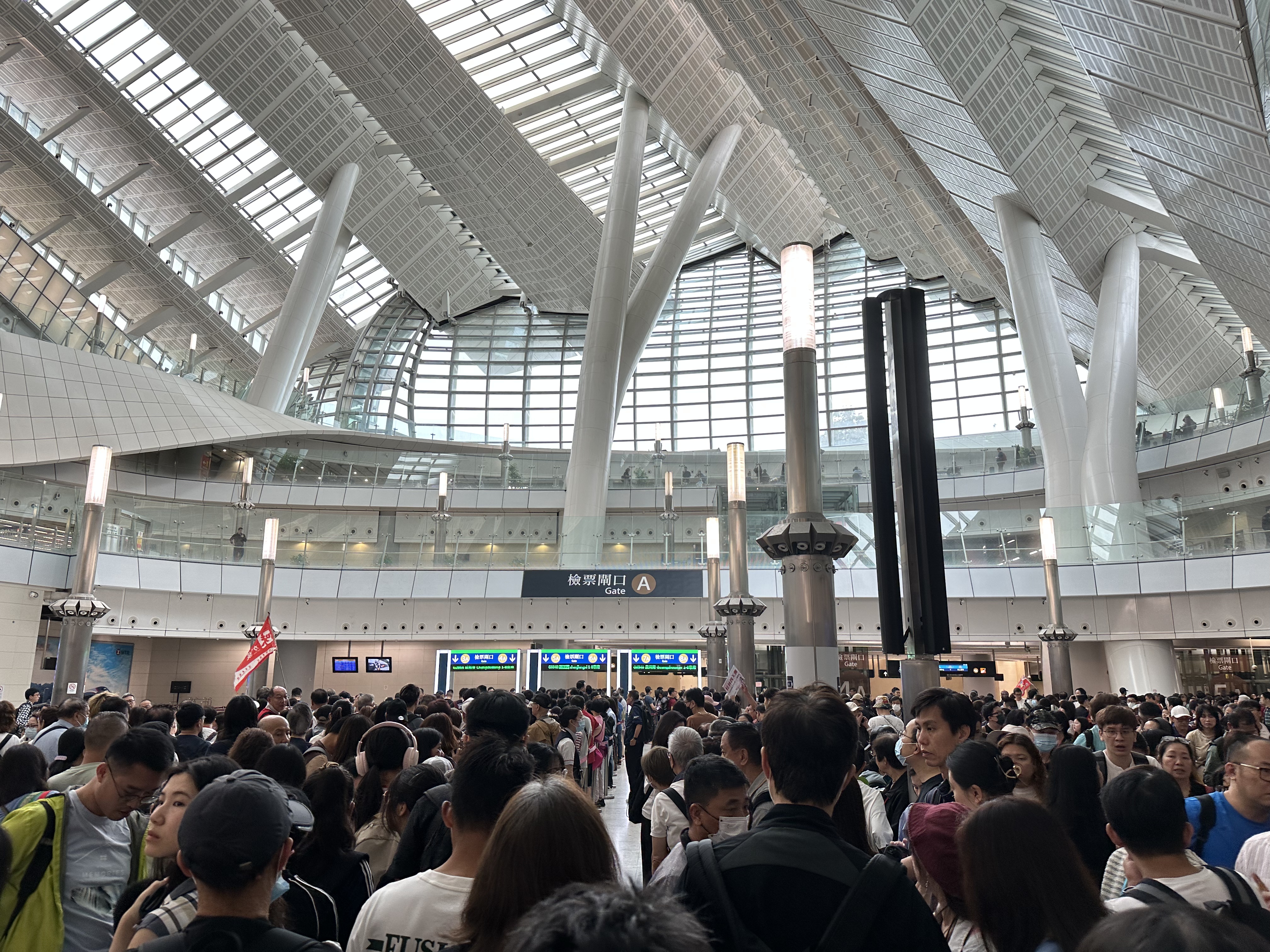 清晨6時的西九龍高鐵站已現人潮洶湧景象,社交媒體實時動態顯示站內出現客流爆滿狀況。多位旅客為應對預期中的大客流,特意提前90分鐘抵達車站。儘管候車大廳內人頭攢動,但現場通過增開閘口、加強引導等措施,維持了有序的候車秩序,整體運輸效率保持正常水平。