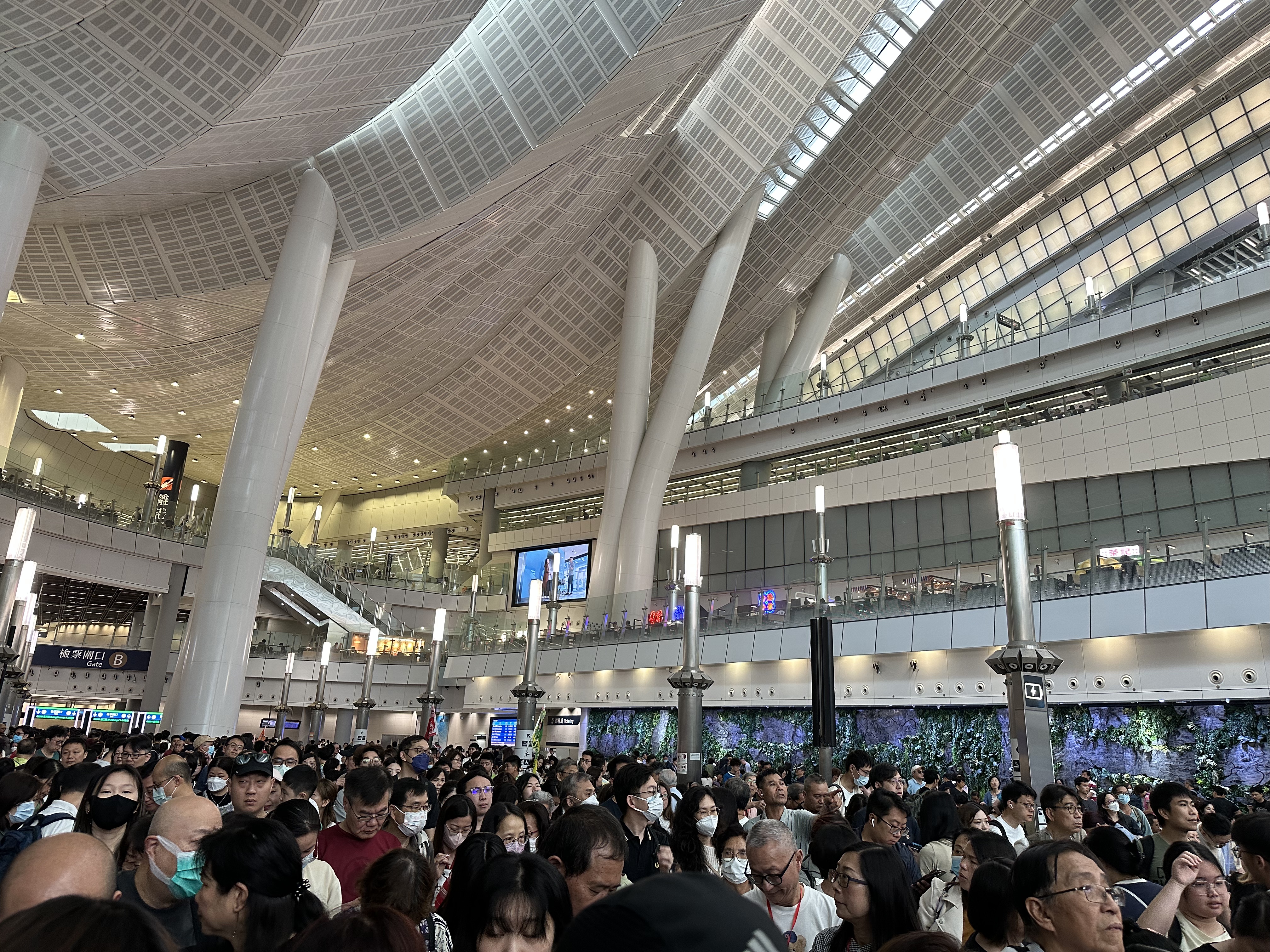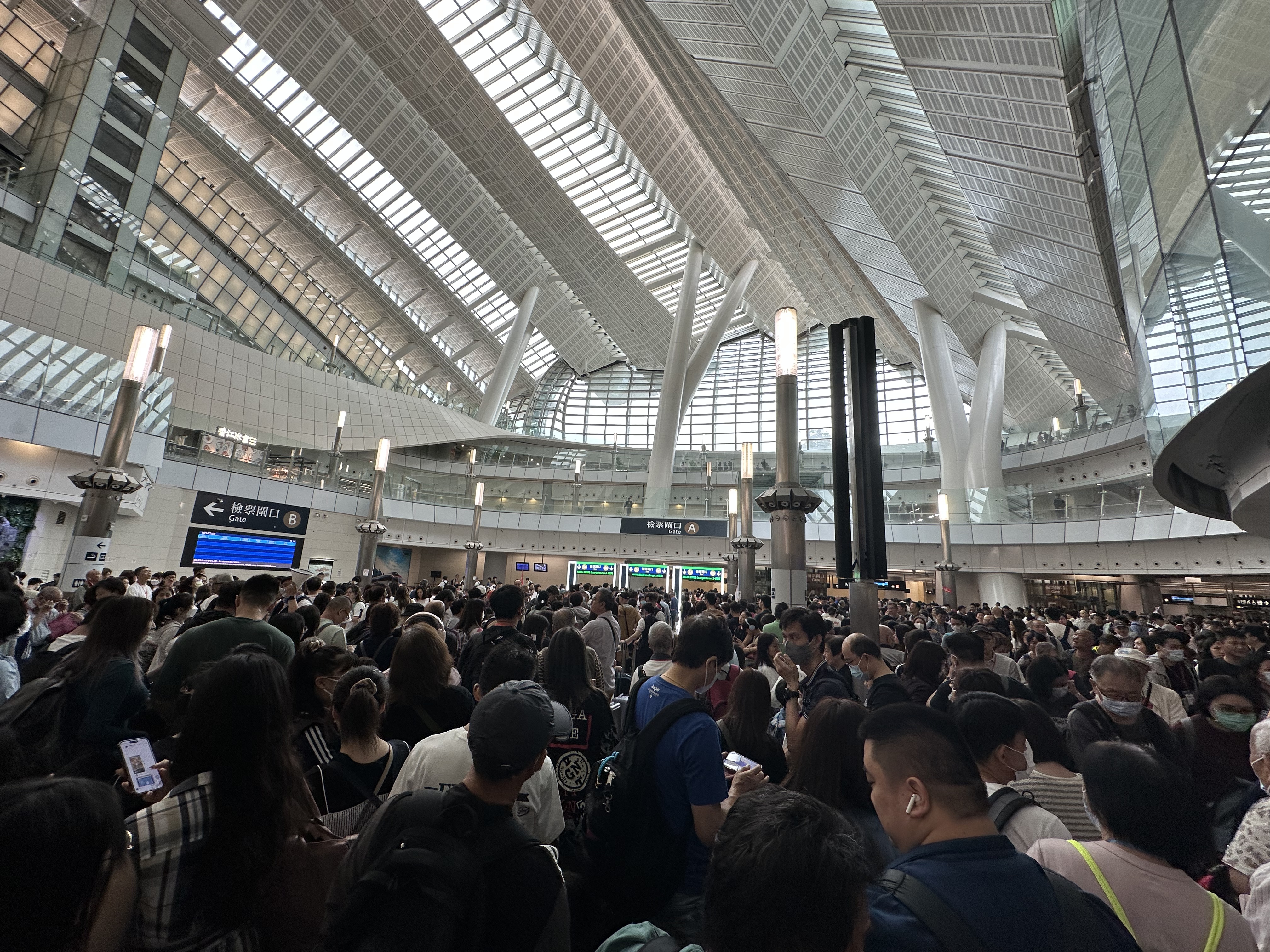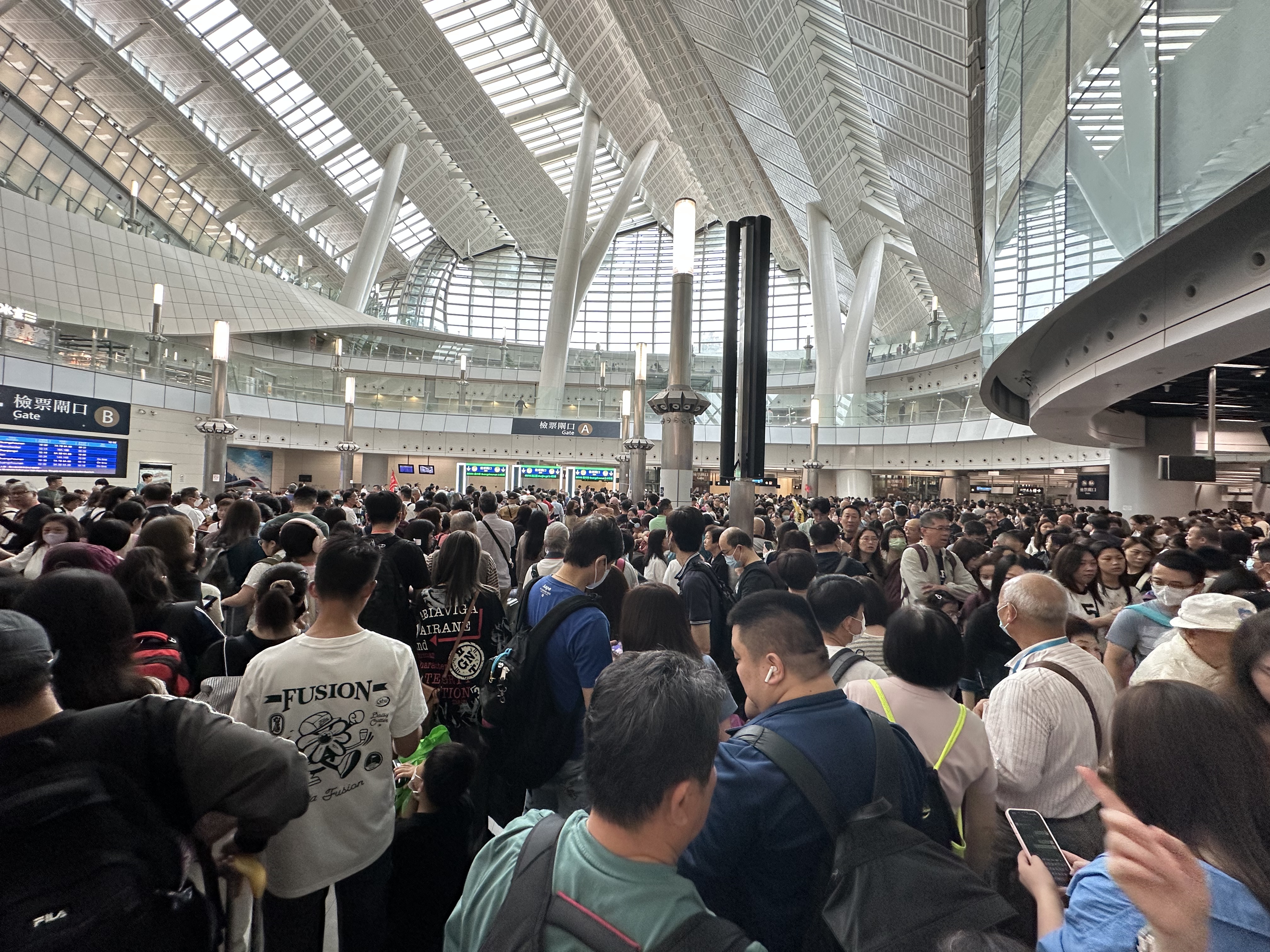 上午10時許,西九龍高鐵站依舊人山人海。市民潘小姐表示,「感覺快連站的地方都沒有了。」候車大廳全是人,不止座位一個不剩,站的地方也比肩繼踵。她表示,自己今天沒有帶行李,因此沒有過海關行李檢查,感覺整體通關大致順暢,用時約十幾分鐘,「雖然人多,但開了很多閘口,檢查證件都沒怎麼排隊。」