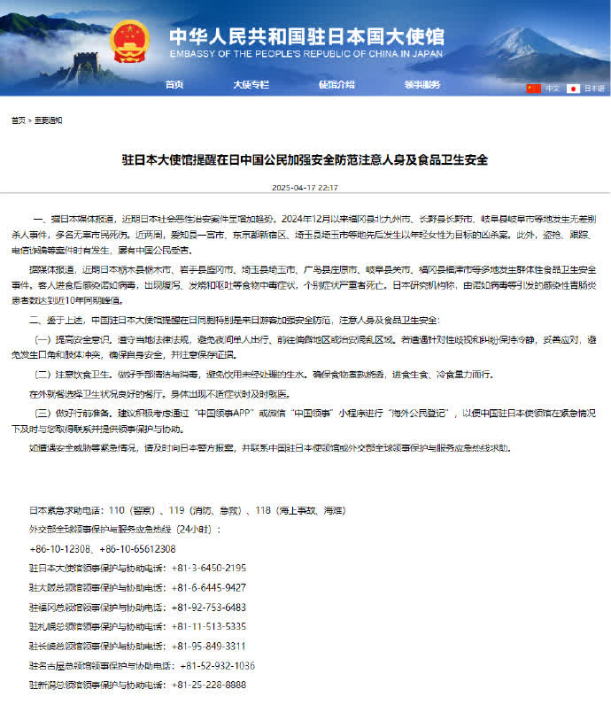 4月17日,駐日本大使館發文提醒在日同胞及來日遊客加強安全防範,注意人身及食品衞生安全。