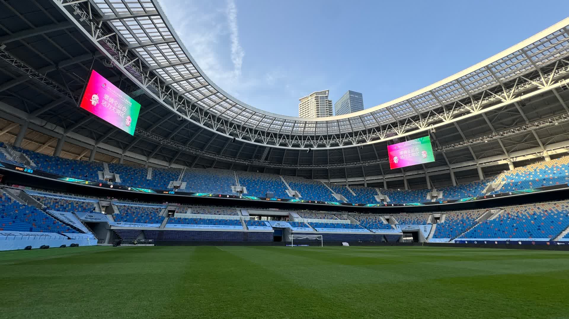 在深圳市體育中心,記者體驗了球員「第一視角」。從運動員通道進入足球場,首先穿過狹長的過道,在進入球場的剎那,視野變得豁然開朗,橢圓形的天幕、蔚藍的天空、密集的三層樓座位、綠茵茵的草坪,一座巨型足球場完整地展現在眼前,讓人不禁想像十五運期間球員進場接受全場歡呼的景象。