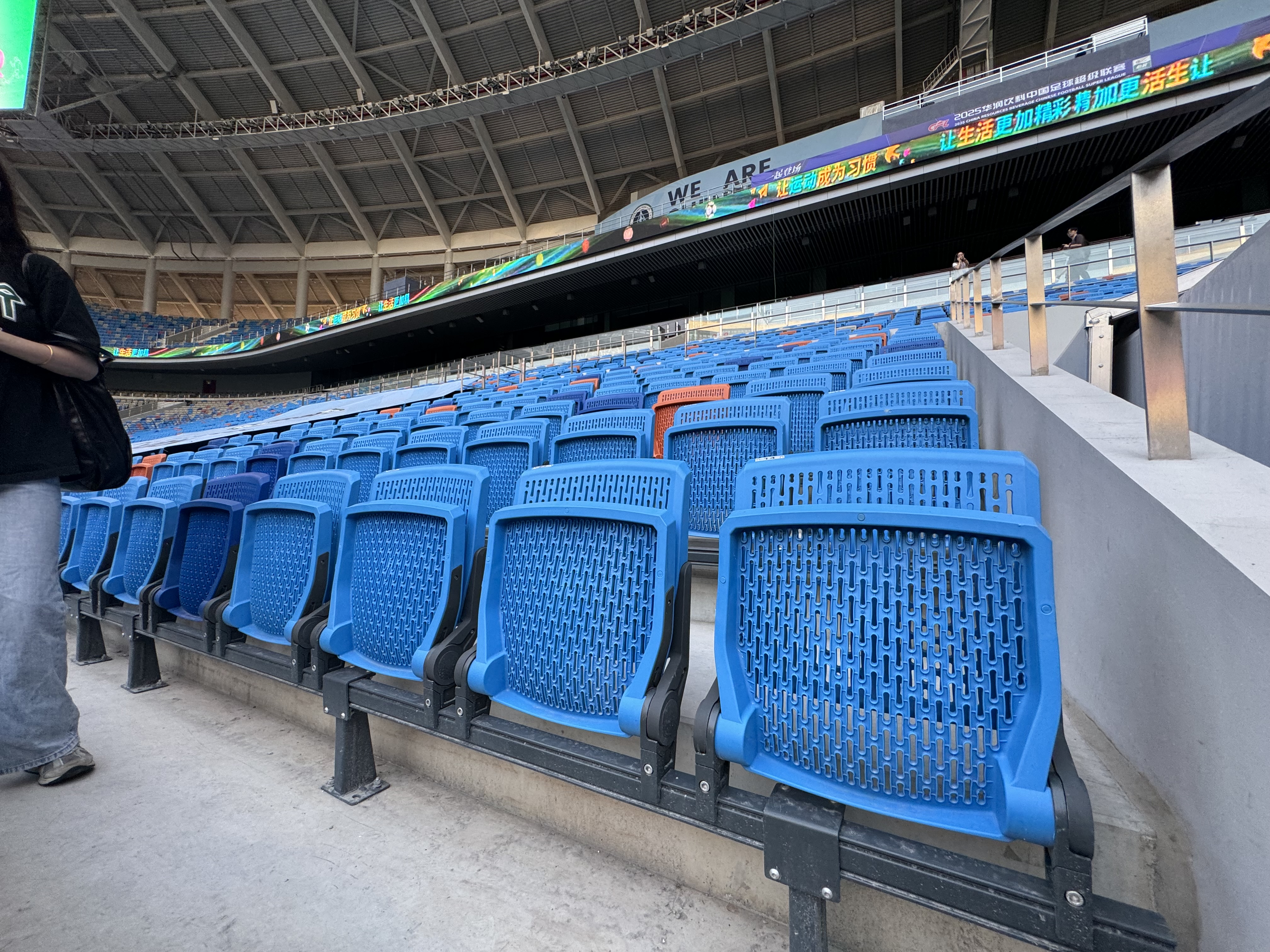 值得一提的是,深圳體育中心還在多個細節有人性化設計。場館衞生間是「潮汐廁所」,配備了「性別可調」系統。「女性觀眾比例高的比賽中,中心可根據票務畫像動態調整男女衞生間比例。「全館1053個廁位中,有594個可實現男/女轉換,入口的電子屏幕會同步調整顯示,極大緩解排隊壓力。」呂佩蕾還介紹,就連看似不起眼的座椅設計上,也隱藏着巧思。全新更換的座椅採用鏤空設計,增強通風透氣性,適應廣東濕熱氣候。