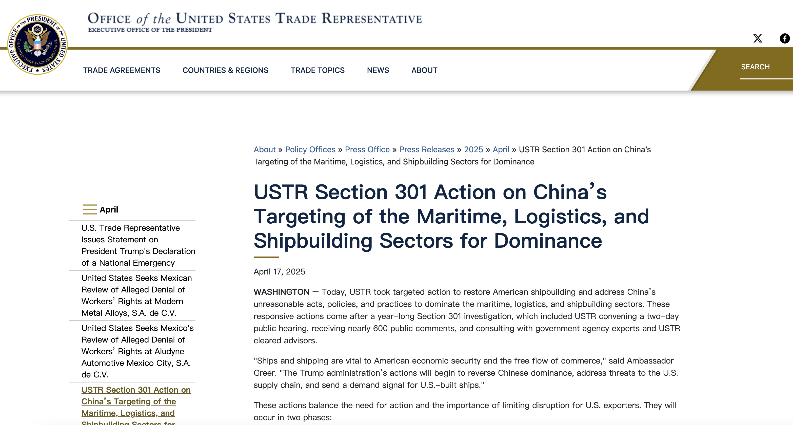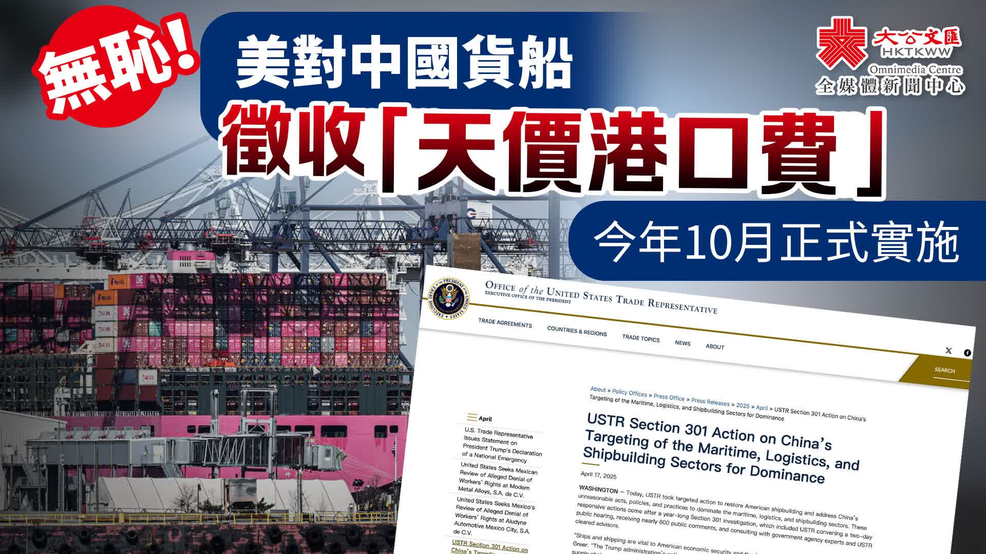 大公文匯全媒體報道,美國貿易代表辦公室(USTR)當地時間4月17日發布最新貿易政策公告,宣布將對所有停靠美國港口的中國船舶實施系統性收費政策,試圖通過所謂「經濟槓桿」削弱中國在全球造船業的統治地位。相關措施預計將在6個月(180天)後正式生效,標誌着中美貿易摩擦向海運領域延伸。