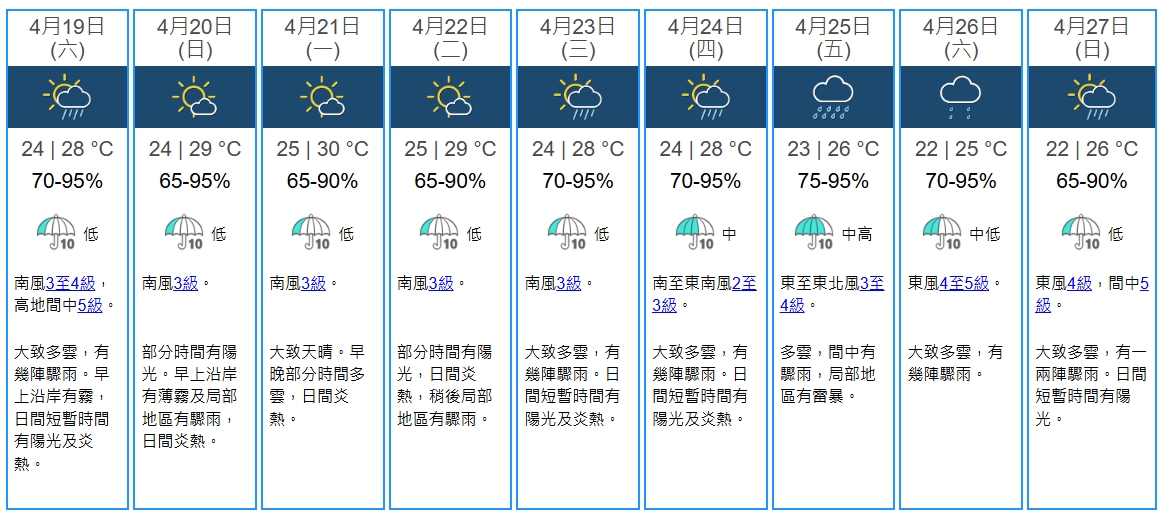 天文台指明日早上最低氣溫約24度,日間短暫時間有陽光及炎熱,最高氣溫約28度。吹和緩偏南風,高地風勢間中清勁。展望隨後兩三日大致天晴,日間炎熱。下周中期短暫時間有陽光,亦有幾陣驟雨。