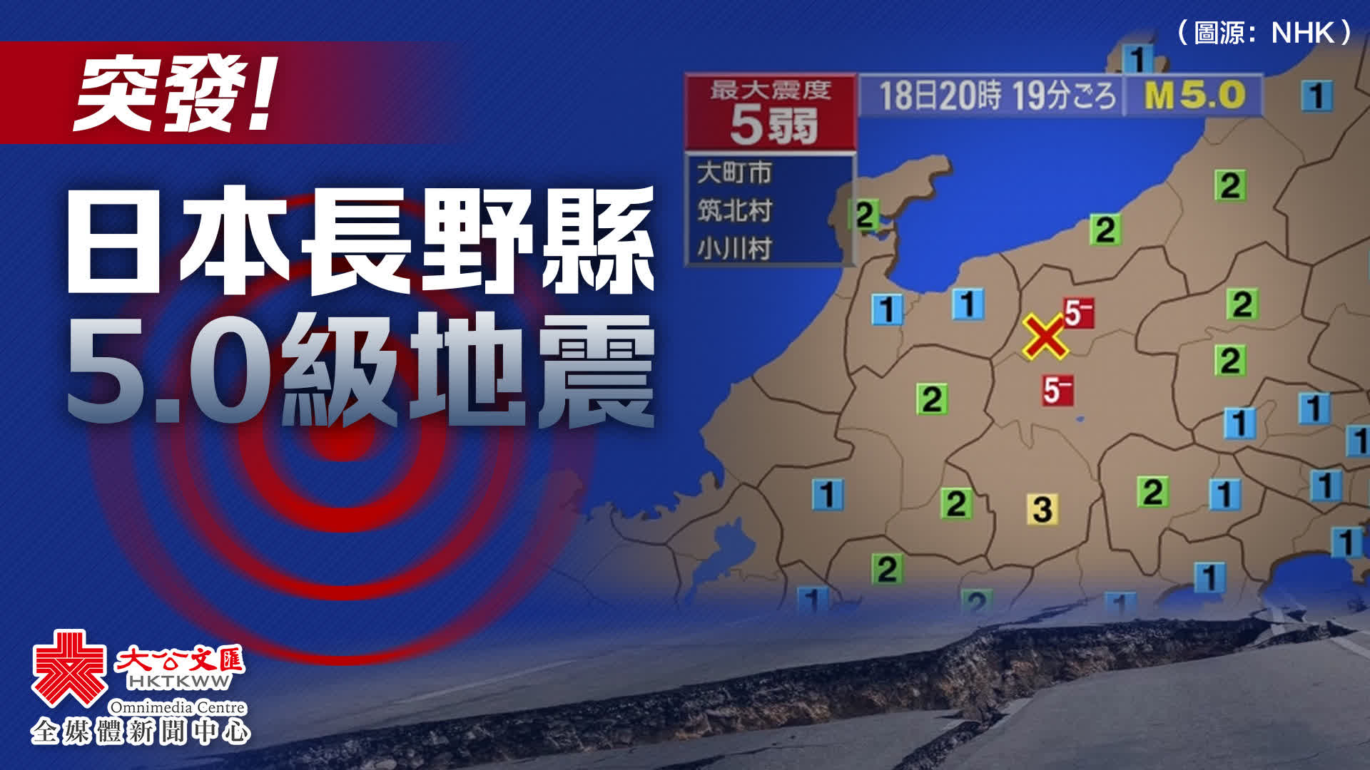 據日本氣象廳4月18日消息,當地時間當天20時19分左右,日本長野縣北部發生5.0級地震,最大震感為震度5弱,震源深度10公里。本次地震沒有引發海嘯的風險。