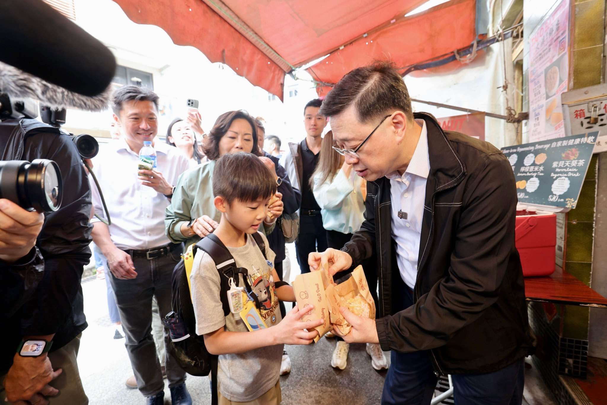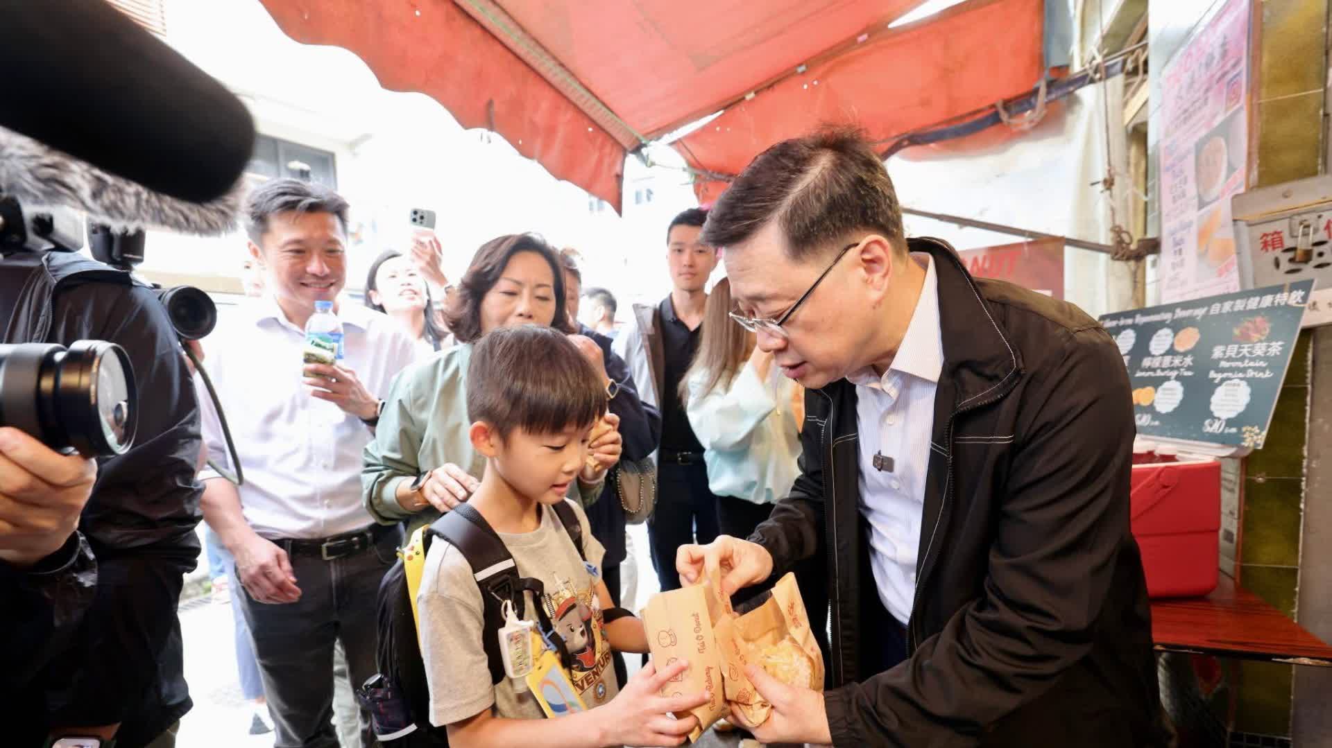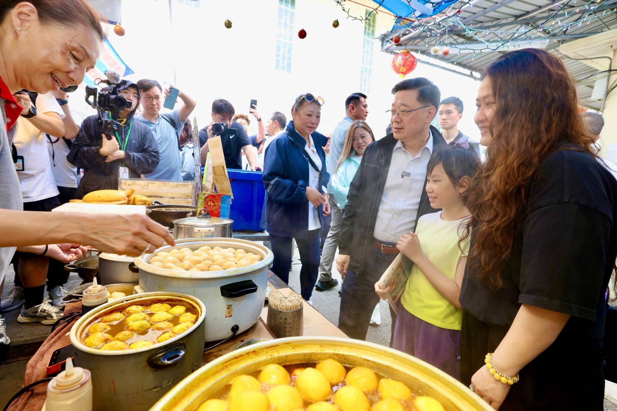 其後,李家超在餅店購買6個人氣美食「沙翁」,分給麥美娟、羅淑佩及旅客品嘗,勉勵商戶趁假期遊客多做多些生意。他又在海味店購買蝦醬、大蝦米、大地魚粉,在途經小食店時,購買大魚蛋與本地遊客分享。